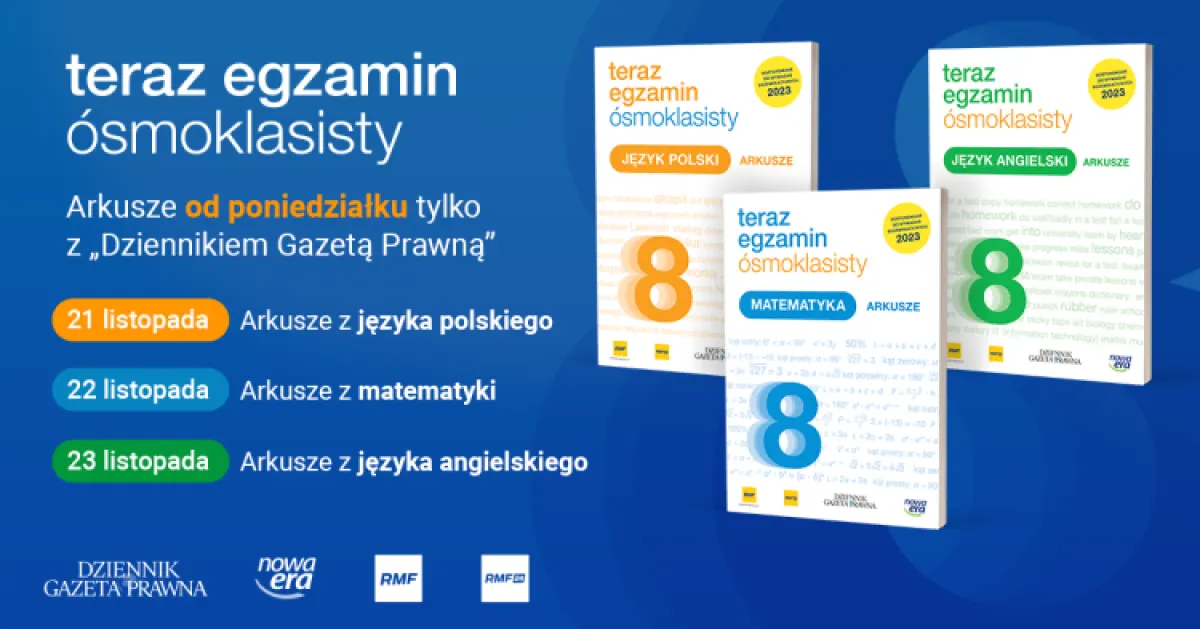 W dniach 21, 22 i 23 listopada warto zakupić kolejne wydania „Dziennika Gazety Prawnej”, do których zostaną dołączone przykładowe arkusze egzaminu ósmoklasisty – dostosowane do wymagań egzaminacyjnych 2023 – przygotowane przez wydawnictwo Nowa Era. Publikacje te zawierają niezbędny materiał ćwiczeniowy dla każdego ucznia, który chce dobrze się przygotować do pierwszego ważnego sprawdzianu wiedzy i umiejętności.