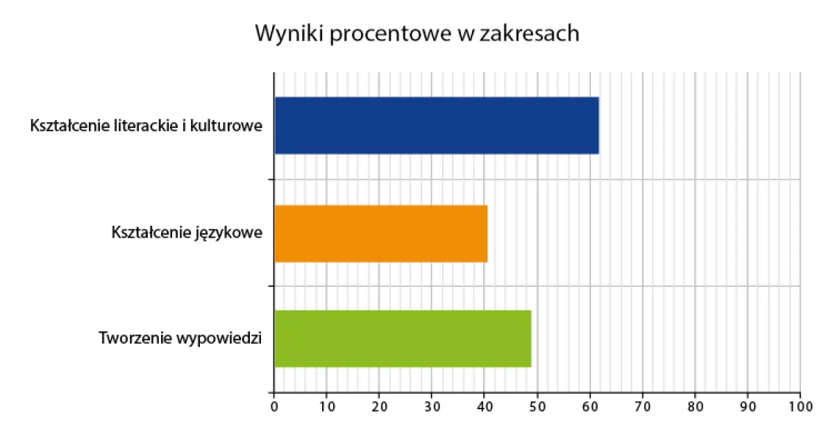 W zadaniach obejmujących kształcenie literackie piszący egzamin zdobyli 9,85 p., co stanowi 61,56% punktów możliwych do zdobycia. Kształcenie językowe wypadło nieco gorzej – uczniowie zdobyli średnio 7,71 p., czyli 40,58% p. możliwych do zdobycia. Tworzenie wypowiedzi oceniono średnio na 7,32 p. możliwych do zdobycia, co daje 48,80%.
