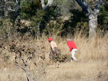 Tak przeszkoleni i bogaci w nowe doświadczenia ruszyliśmy na poszukiwanie stada bawołów. Dzięki ich wielkiej przewodniczce łatwo udało nam się je znaleźć. Najpierw zobaczyliśmy słonia, a potem okazałe stado. Tym razem sprawa była poważna i nasi opiekunowie, Tomek i Moris, postanowili, że będziemy podchodzić do nich pojedynczo. Tzn. Tomek i Moris zabierali po jednym delikwencie lekko obytym już w buszu i w takich małych zespołach z doświadczonym rangerem zbliżaliśmy się do tych niebezpiecznych zwierząt w nadziei, że nie będą miały ochoty nas stratować. Dla każdego z nas było to niesamowite przeżycie. To już nie była zabawa w trawie z gnu, ale prawdziwa dawka adrenaliny.