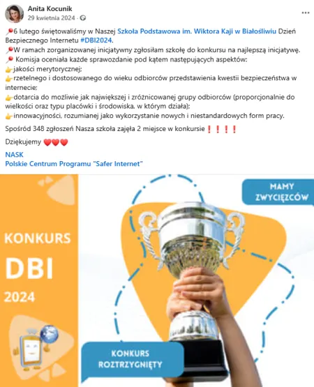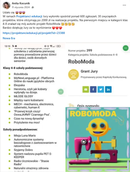 Zrealizowała projekt Fundacji Różowa Skrzyneczka, zapewniając uczennicom dostęp do środków higieny. Jest opiekunem szkolnego wolontariatu, organizuje liczne akcje społeczne i charytatywne (Projekt Młode Głowy, Akcja Żonkile, zbiórki, kampanie profilaktyczne). Współorganizowała szkolny kiermasz świąteczny, z którego dochód przeznaczono na kącik czytelniczy. Jej działania są realnym wsparciem dla uczniów, rodziców i całej społeczności szkolnej.
