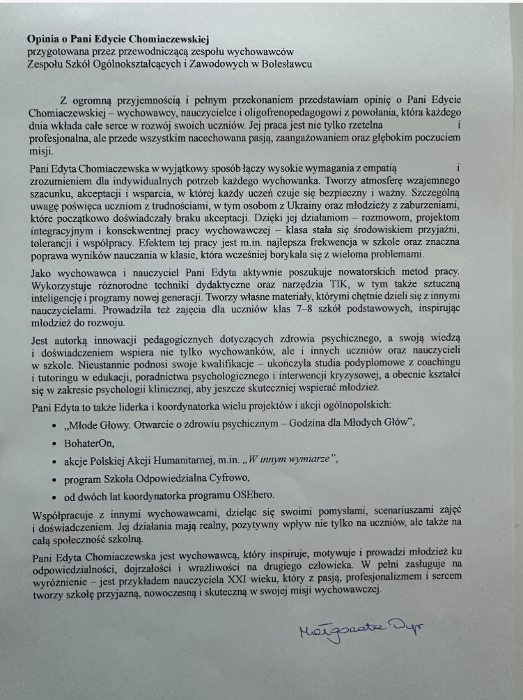 Jest autorką innowacji pedagogicznych dotyczących zdrowia psychicznego oraz licznych akcji wolontariackich, które odmieniły atmosferę w klasie i całej szkole. Jako liderka ogólnopolskich projektów ukończyła wiele studiów podyplomowych, by jeszcze skuteczniej wspierać młodzież. Jej wiedza i doświadczenie służą nie tylko wychowankom, ale też uczniom z innych klas i całemu gronu pedagogicznemu. Odważnie sięga po nowoczesne technologie – wykorzystuje sztuczną inteligencję, programy multimedialne i TIK. Wprowadziła certyfikowane kursy online z zakresu cyberbezpieczeństwa, tworzy własne materiały i dzieli się nimi z innymi nauczycielami. Prowadzi zajęcia dla młodzieży ze szkół podstawowych i specjalnych, inspirując ją do dalszej edukacji. Dla swoich uczniów jest kimś znacznie więcej niż nauczycielem – jest przewodnikiem, powiernikiem i inspiracją. Potrafi dostrzec talent w cichym, nieśmiałym dziecku, podać rękę temu, kto się potknął, i rozbudzić w każdym przekonanie, że warto wierzyć w siebie.