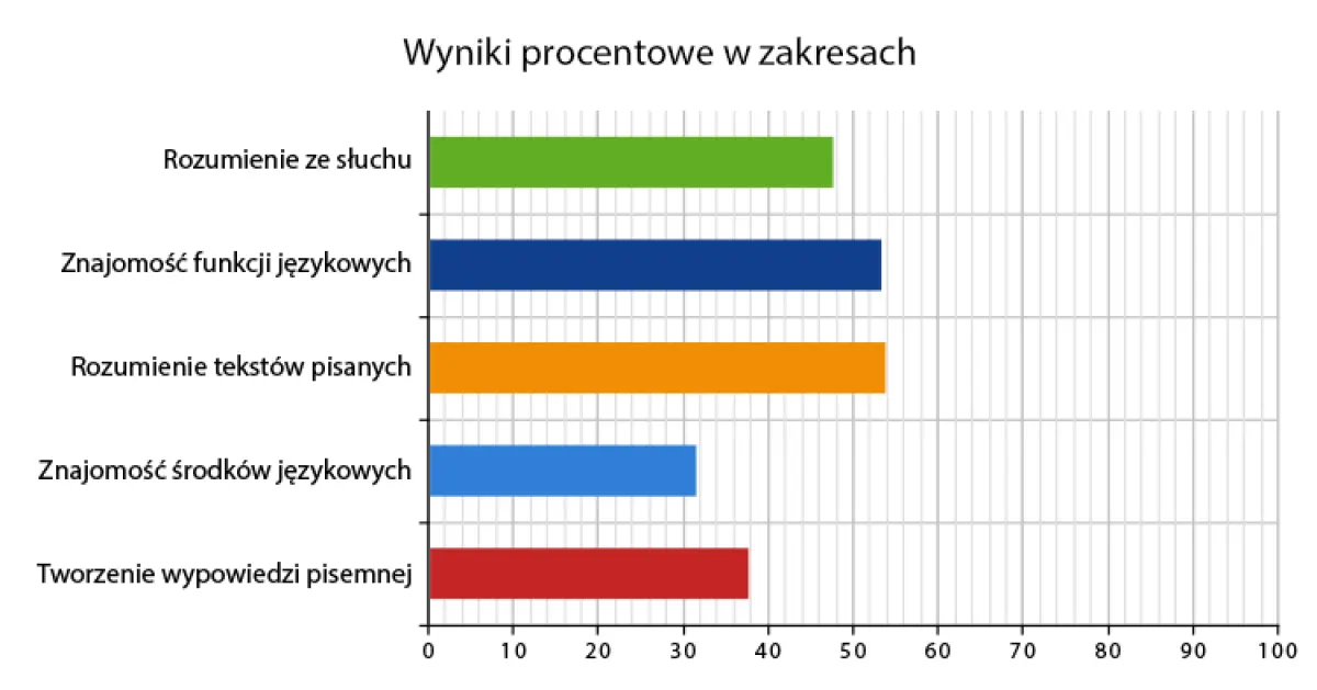 Tak jak w pierwszej części egzaminu, również zadania zamknięte z zakresu znajomości funkcji językowych w dużej mierze nie nastręczyły uczniom problemu. Najłatwiejsze okazały się zadanie 5 (wielokrotny wybór), gdzie uczniowie uzyskali wynik 69,5%, oraz zadanie 4 (dobieranie), z wynikiem 63,25%. Natomiast rozwiązując zadanie 6 (uzupełnienie dialogów), uczniowie uzyskali średnio zaledwie 31,3%. Sprawność mówienia i ustnej komunikacji jest najtrudniejszą umiejętnością. Uczniowie boją się mówić z uwagi na brak dostatecznej pewności językowej, obawę przed popełnieniem błędu czy braki w słownictwie. Wynika to także z faktu, że niewielu nauczycieli ma komfort i wystarczającą ilość czasu, by móc pozwolić sobie na rozwijanie umiejętności mówienia w czasie zajęć lekcyjnych. Nowa konstrukcja egzaminu w pewnym stopniu to zmienia, ponieważ pojawiają się zadania wymagające nieco szerszych kompetencji komunikacyjnych, co wspierają także zapisy nowej podstawy programowej. Wyniki diagnozy jasno dają do zrozumienia, że uczniowie mają problem z konstruowaniem poprawnych zdań, nie wiedzą, jak prosić, dziękować, proponować czy zakazywać itp. Jak zatem radzić sobie z tym problemem? Warto zwrócić uwagę na tzw. scaffolding. Dzięki temu podajemy uczniom określone ramy językowe ułatwiające im budowanie zdań, dialogów czy konwersacji. Warto dopasować te ramy do poziomu naszych uczniów i elastycznie zmieniać je i ograniczać wraz z rozwojem ich kompetencji.