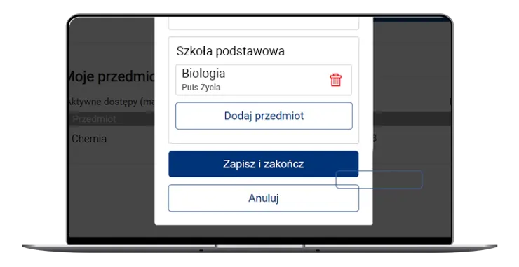 3. W nowo otwartym oknie wypełnij wszystkie potrzebne informacje. Usuń przedmioty, na których nie pracujesz już z publikacjami Nowej Ery. Dodaj przedmioty, w których decydujesz się wprowadzić serię Nowej Ery. Po zakończonej pracy kliknij przycisk Zapisz i zakończ.