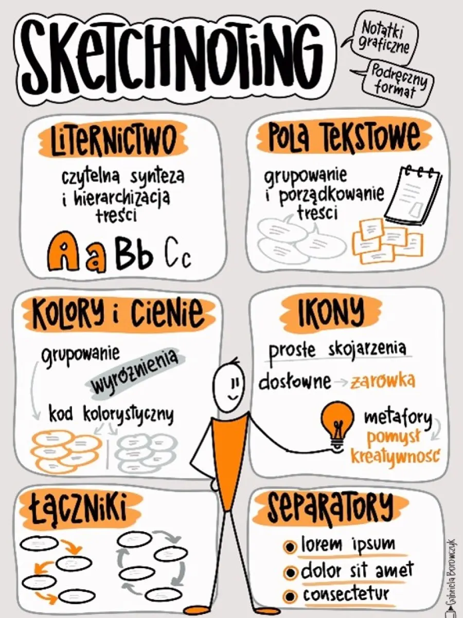 W sketchnotingu obserwujemy różne nurty – są notatki schematyczne, symetryczne i mocno uporządkowane, są też bardziej chaotyczne, intuicyjne, odzwierciedlające flow i naturalny tok myślenia twórcy (nie zawsze czytelny dla postronnego odbiorcy). Jedne sketchnotki są czarno-białe lub monochromatyczne, oszczędne w kolorystyce, inne zaś megakolorowe. Nie zawsze to, co czytelne dla autora, jest równie czytelne dla kogoś, kto ogląda notatkę po raz pierwszy. Ucząc nauczycieli sketchnotingu, zawsze podkreślam kilka rzeczy.- Dobra sketchnotka powinna być przede wszystkim przejrzysta. I to zarówno pod względem czytelności napisów, jak i wizualnego uporządkowania. Jeśli uczniowie zadają pytania, bo nie rozumieją zapisów z notatki graficznej, to znaczy, że trzeba ją poprawić.