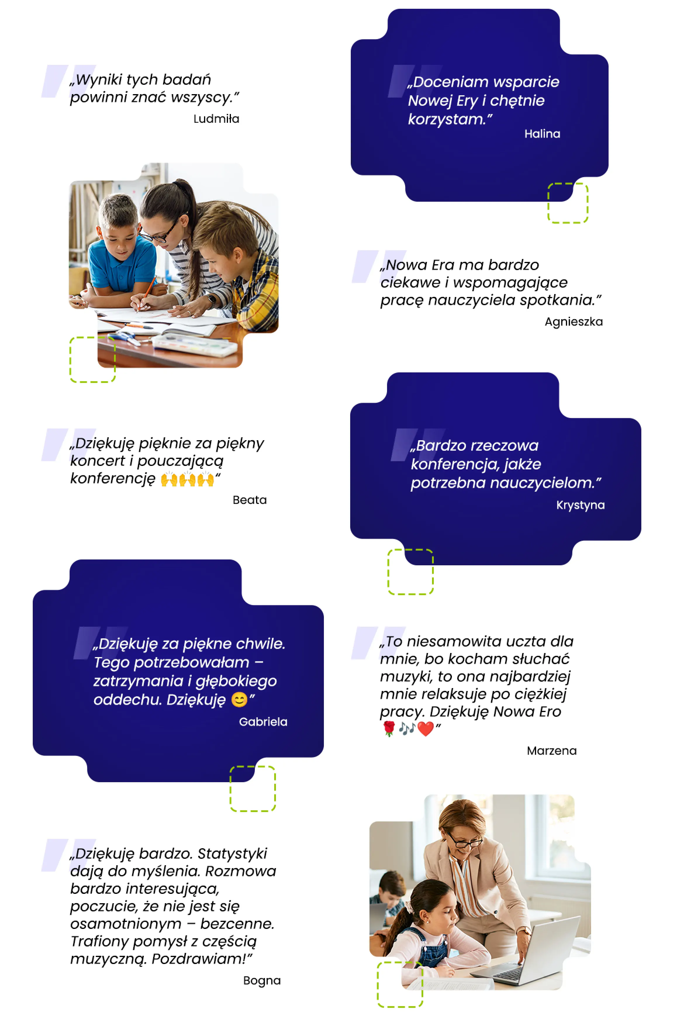 Głos nauczycieli z raportu stał się impulsem do działań, które pokazują szkołę taką, jaka jest naprawdę — pełną relacji, empatii i codziennych decyzji, które mają znaczenie.Dlatego powstał cykl „Z notatnika nauczyciela” – krótkie spotkania video i e-booki z dr Ewą Jarczewską-Gerc, które pomagają odzyskać równowagę i energię w zawodzie.