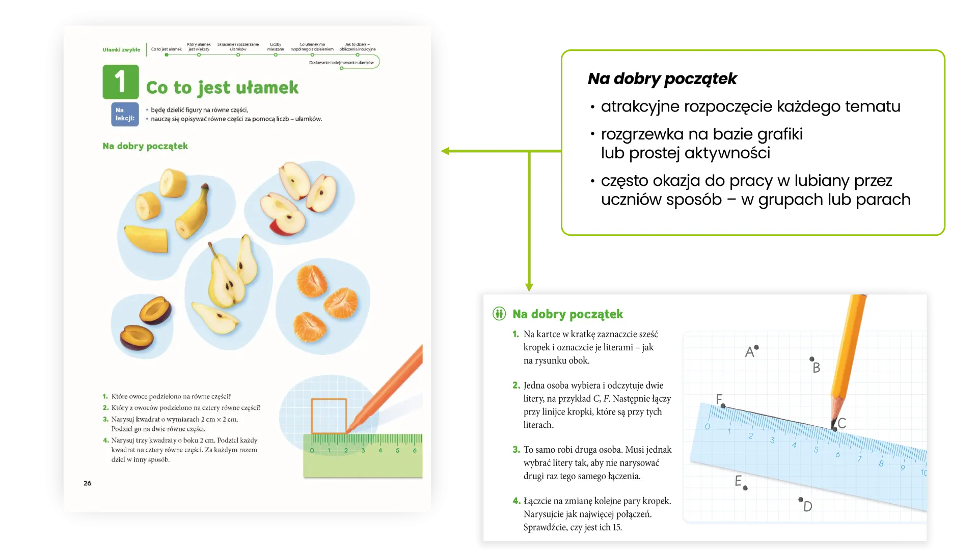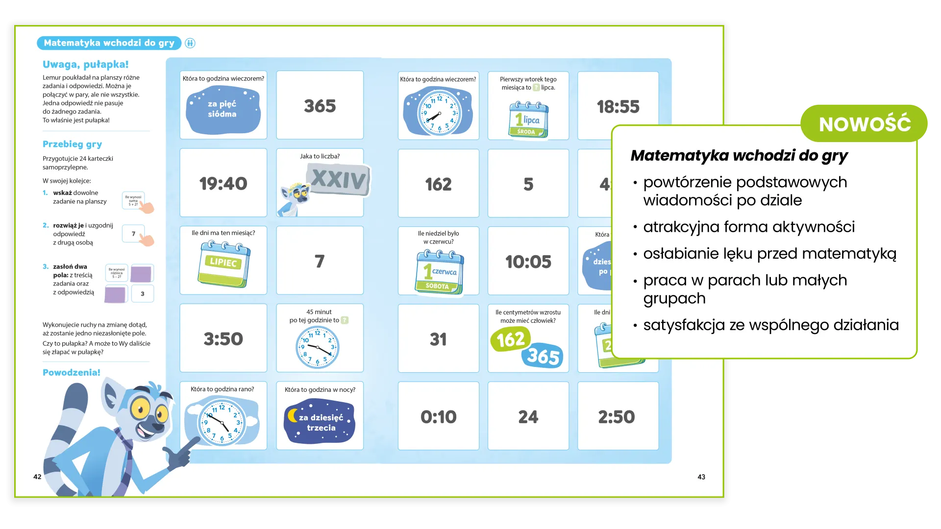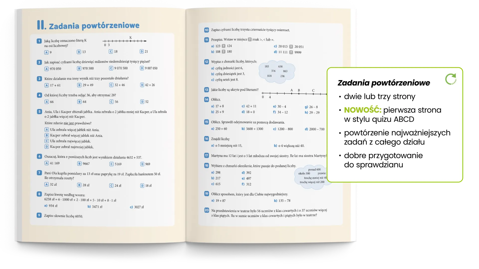 Ciekawe pomysły na początki lekcji angażują uczniów i nauczycieli. Różnorodne formy pracy pomagają utrzymać rytm zajęć i dostarczają nauczycielowi bieżącej informacji o postępach klasy. Przejrzysta szata graficzna i większy format ułatwiają uczniom przejście z klasy 3 do 4.