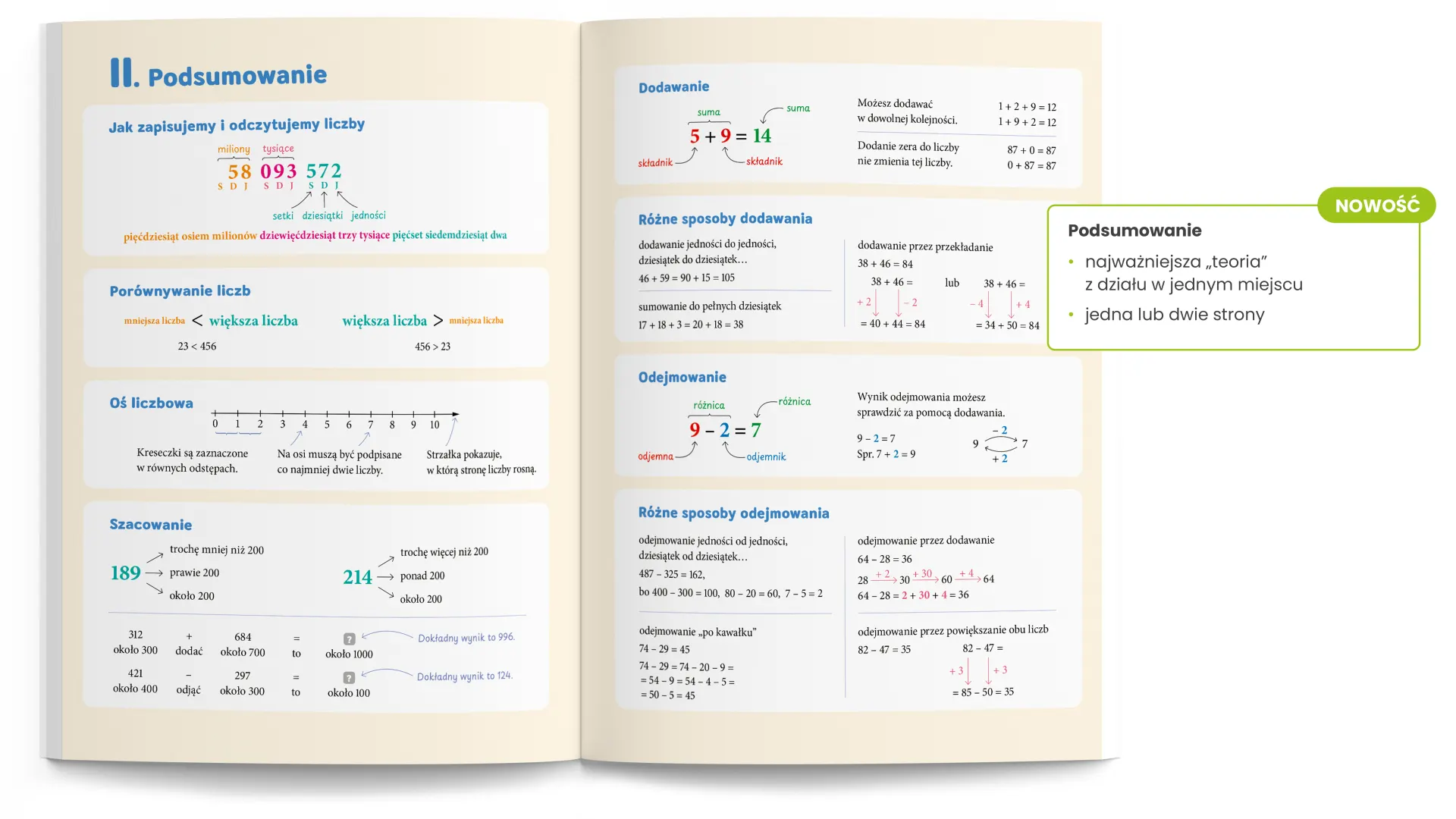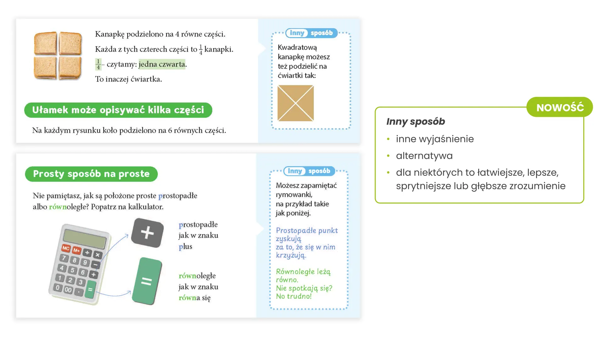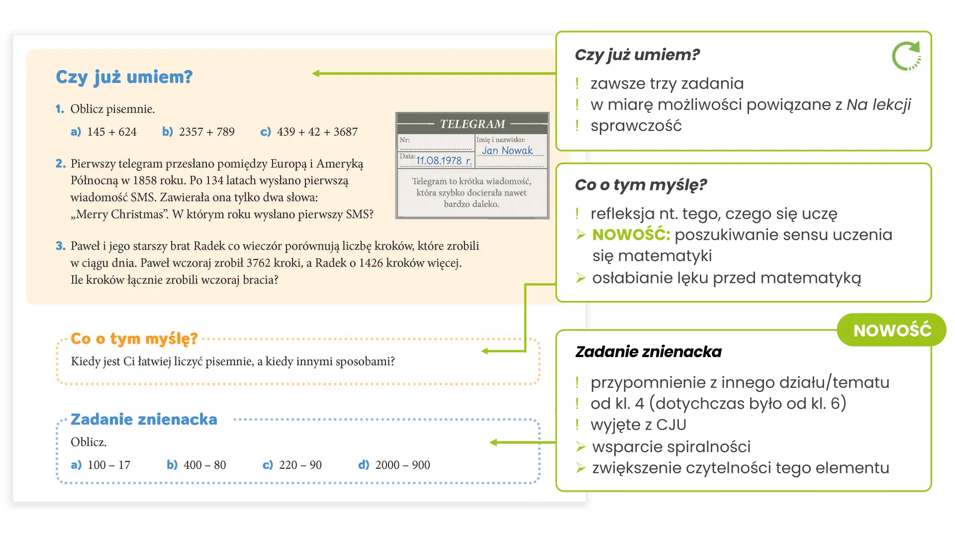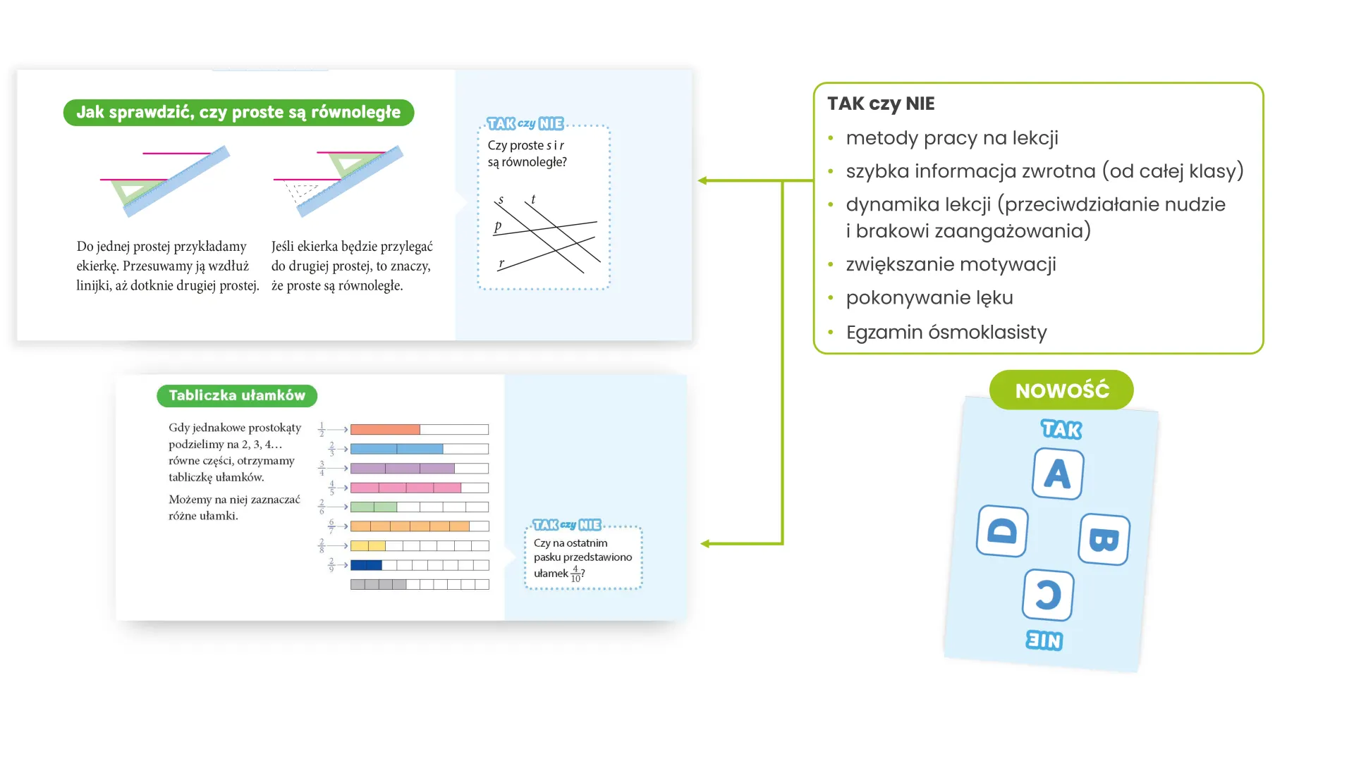 Regularne odwoływanie się do wcześniej zdobytej wiedzy, syntetyczne podsumowania oraz zadania utrwalające porządkują materiał i wzmacniają poczucie sprawczości. Uczniowie poznają różne sposoby rozwiązania tego samego problemu, dzięki czemu łatwiej znajdują własną drogę do zrozumienia.