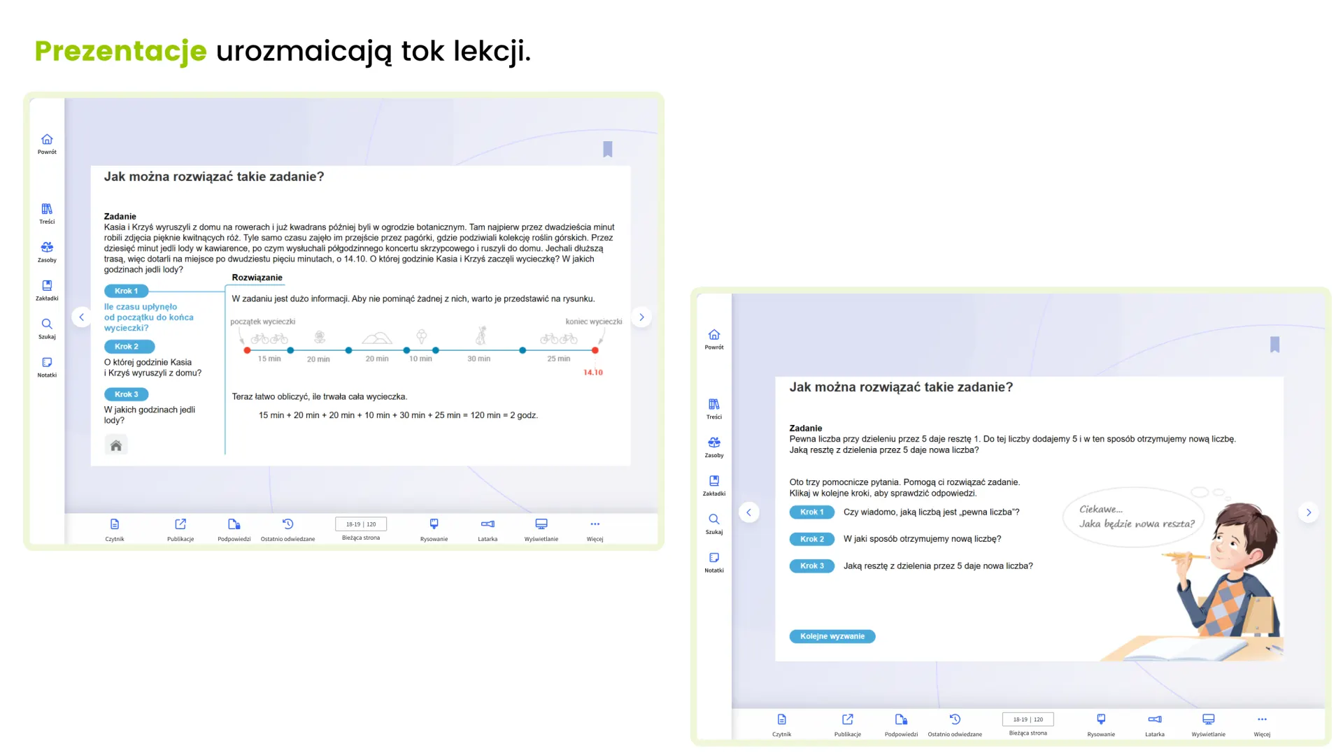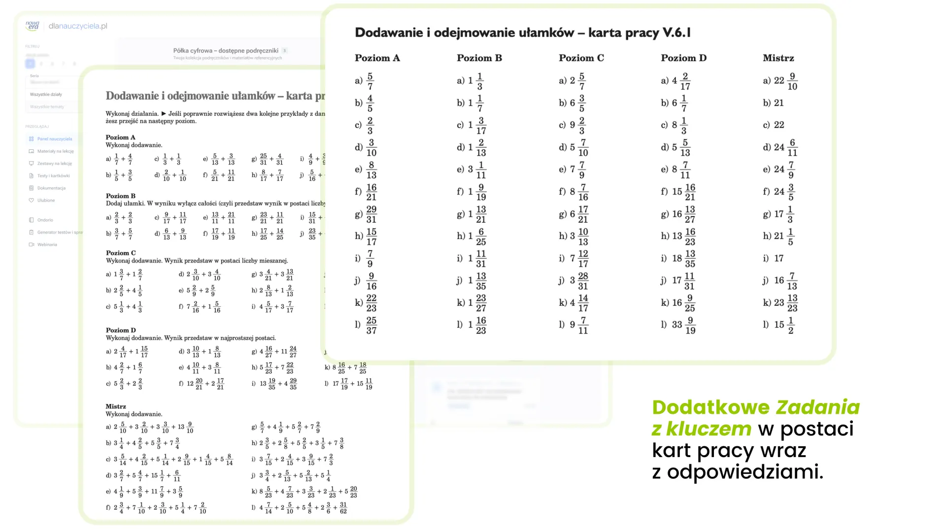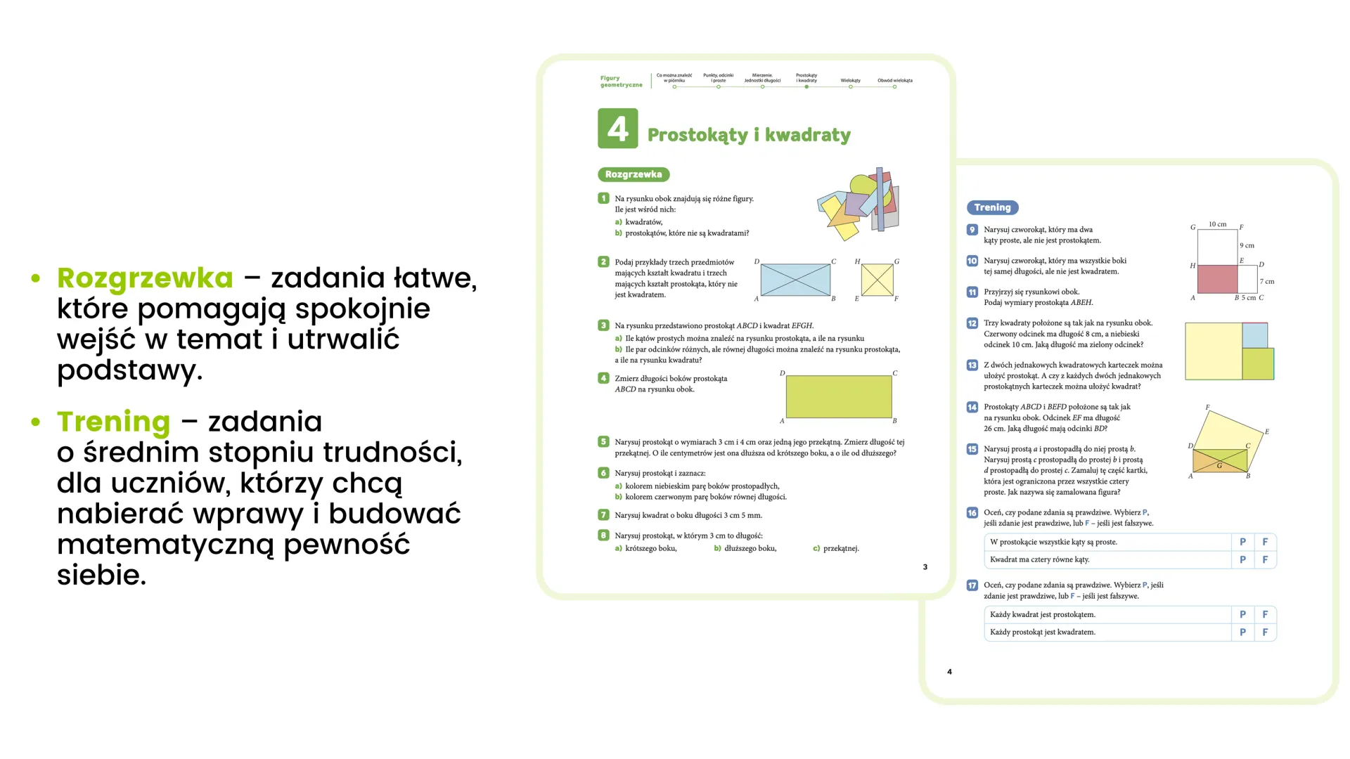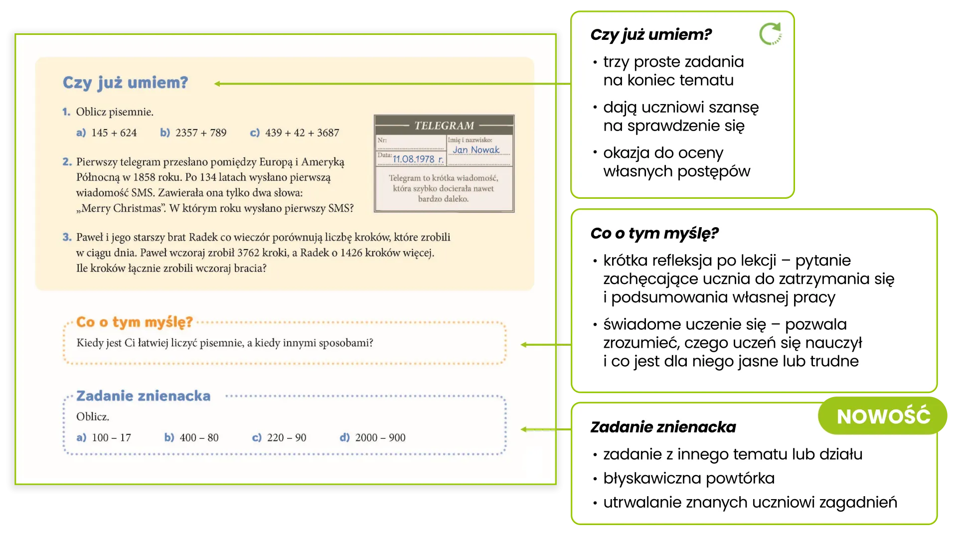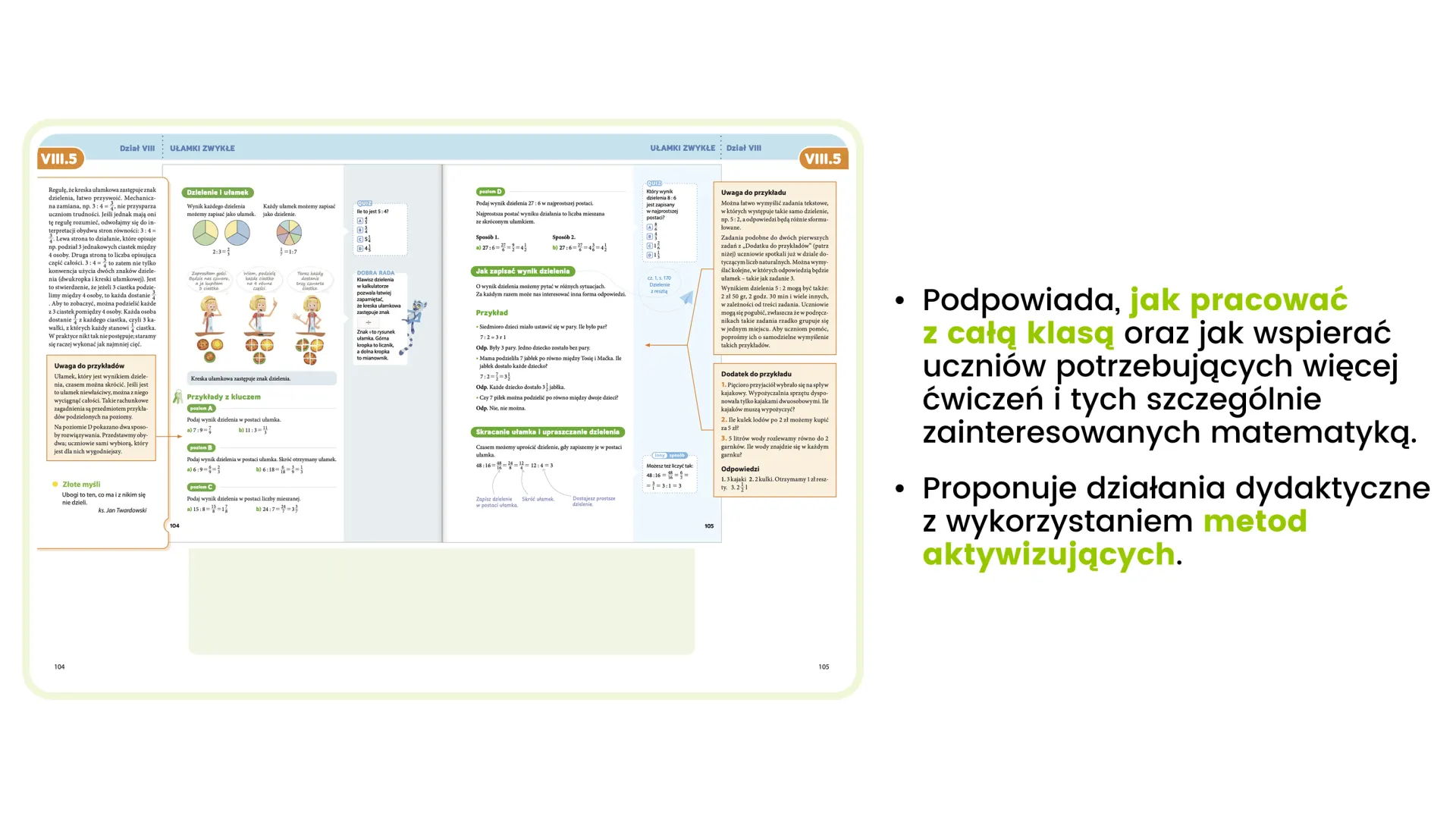Uczniowie najpierw poznają na przykładach nowe techniki działania, a następnie samodzielnie mogą je przećwiczyć na podobnych zadaniach, we własnym tempie. Stopniowanie trudności i jasne wskazówki sprawiają, że każdy może osiągnąć sukces na miarę swoich możliwości.