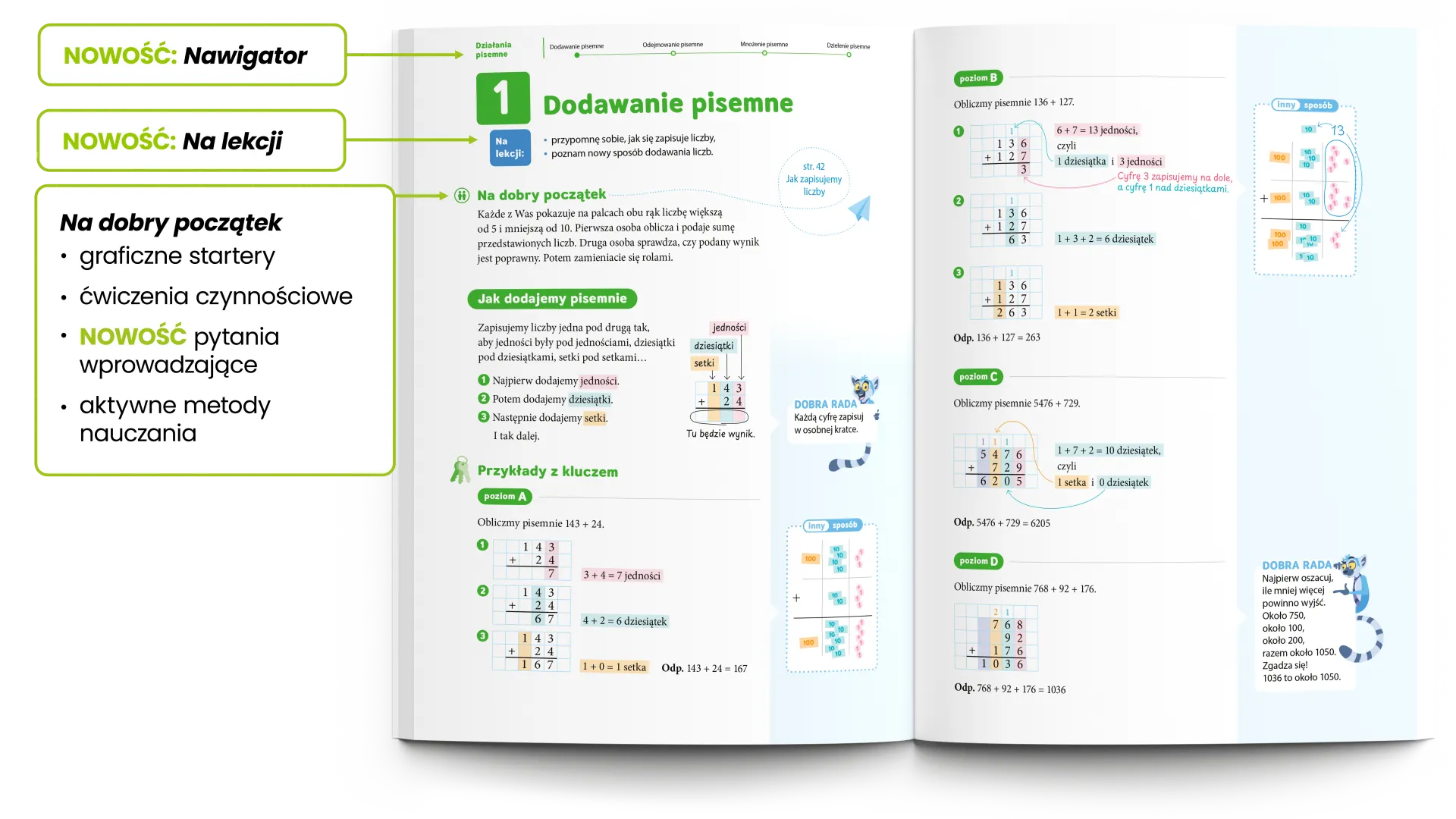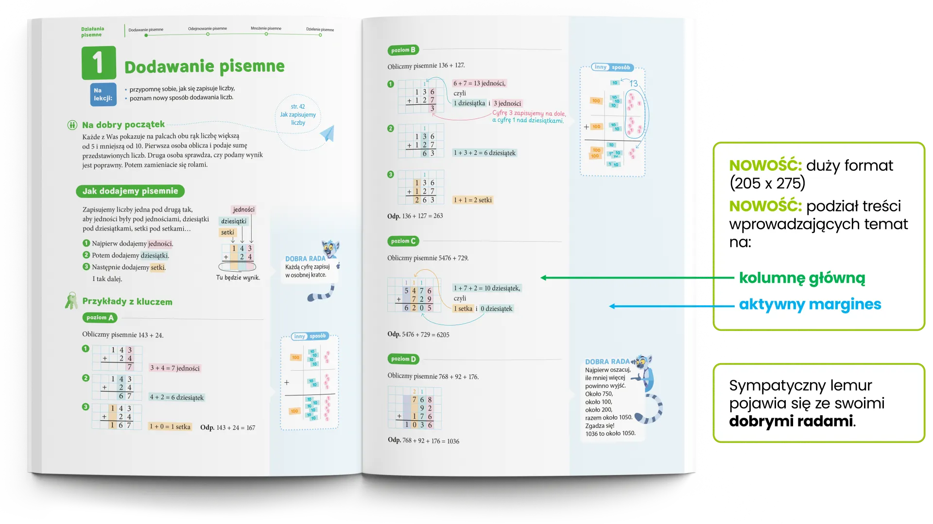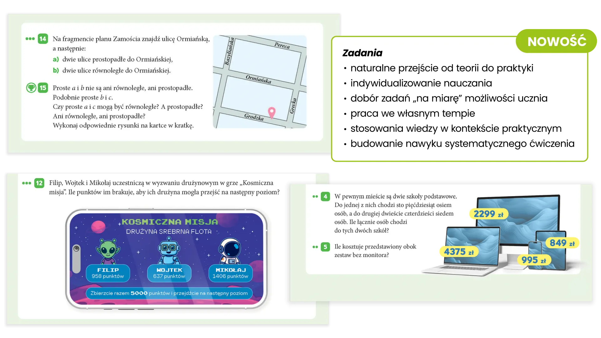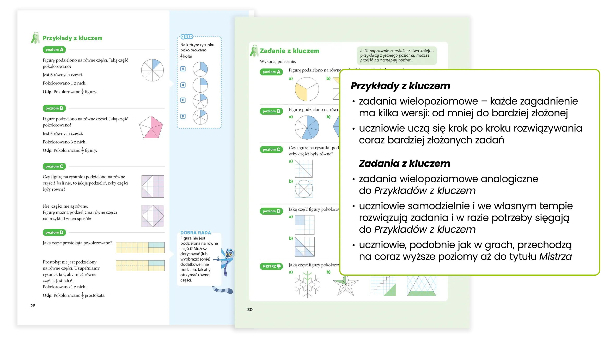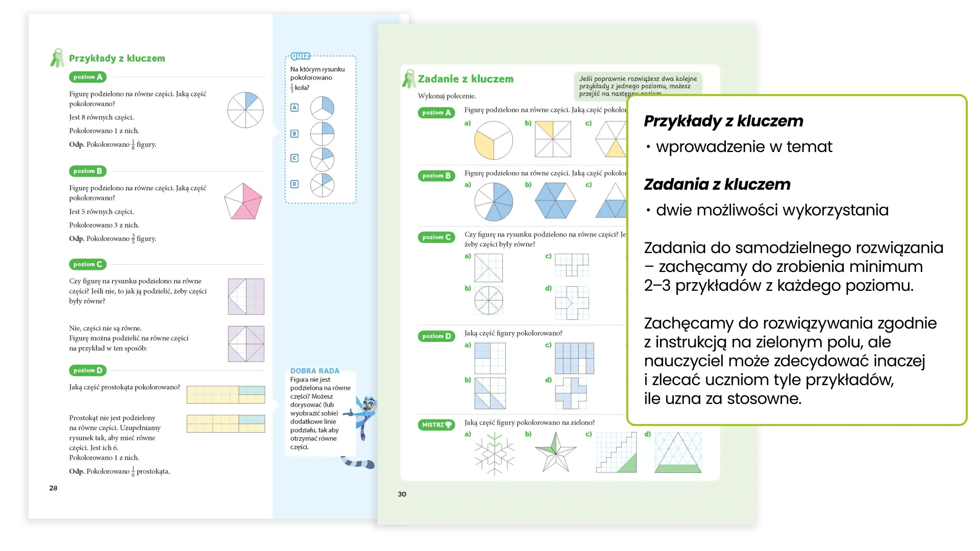 Uczniowie najpierw poznają na przykładach nowe technik działania, a następnie samodzielnie mogą je przećwiczyć na podobnych zadaniach, we własnym tempie. Stopniowanie trudności i jasne wskazówki sprawiają, że każdy może osiągnąć sukces na miarę swoich możliwości.