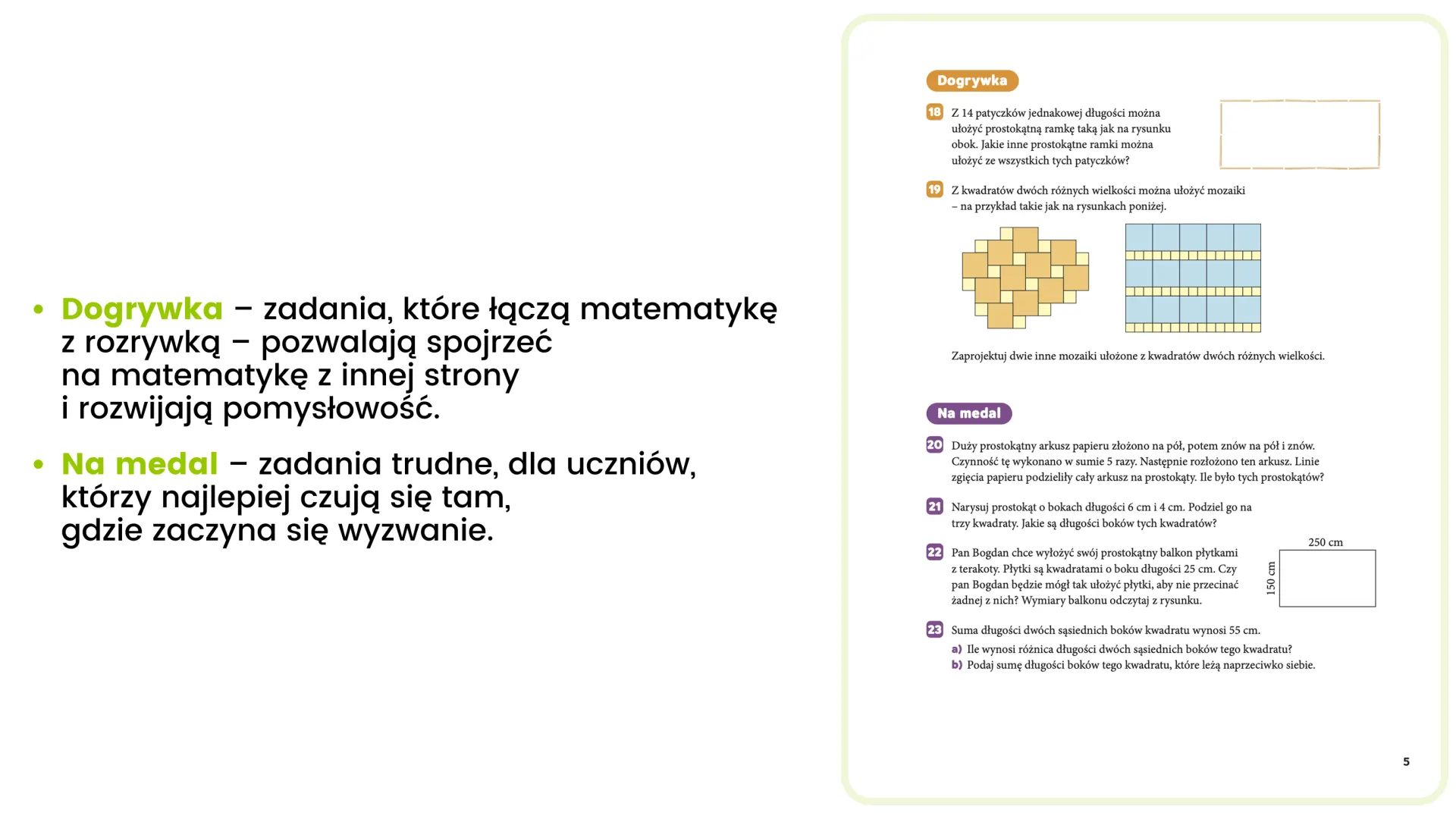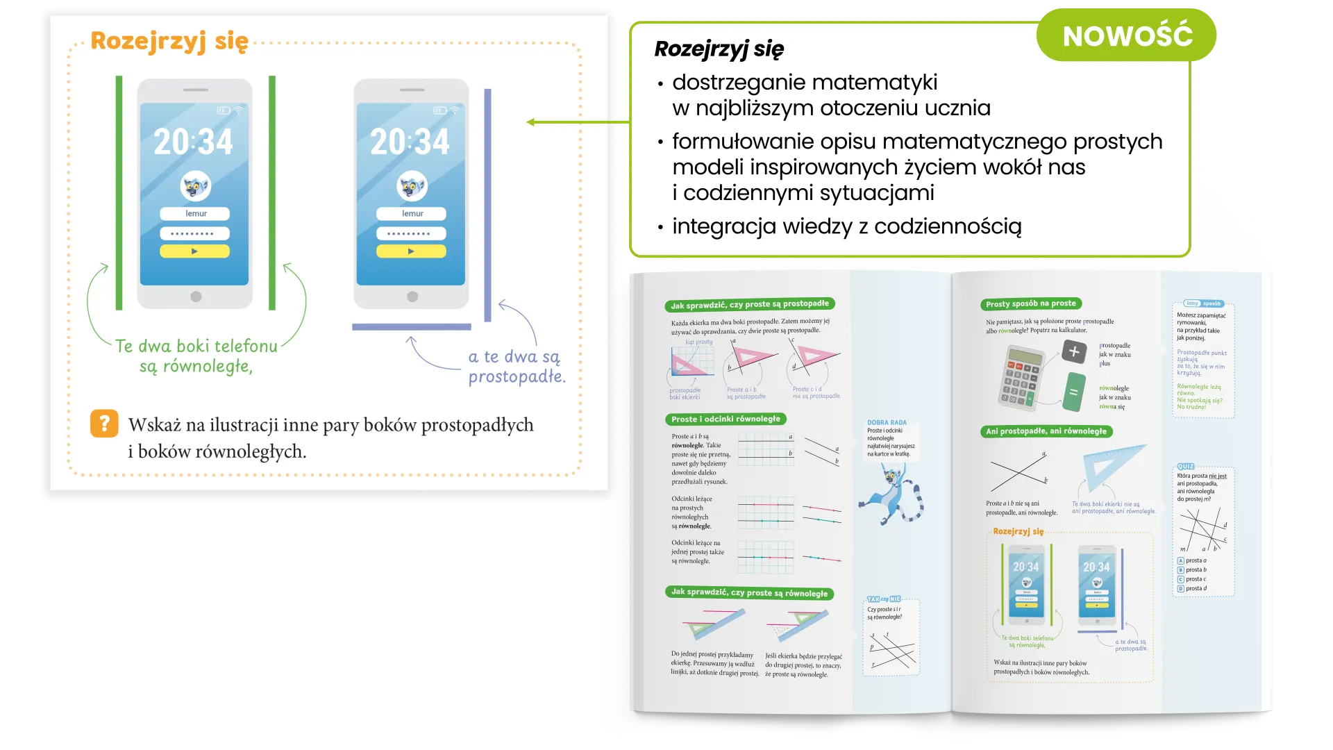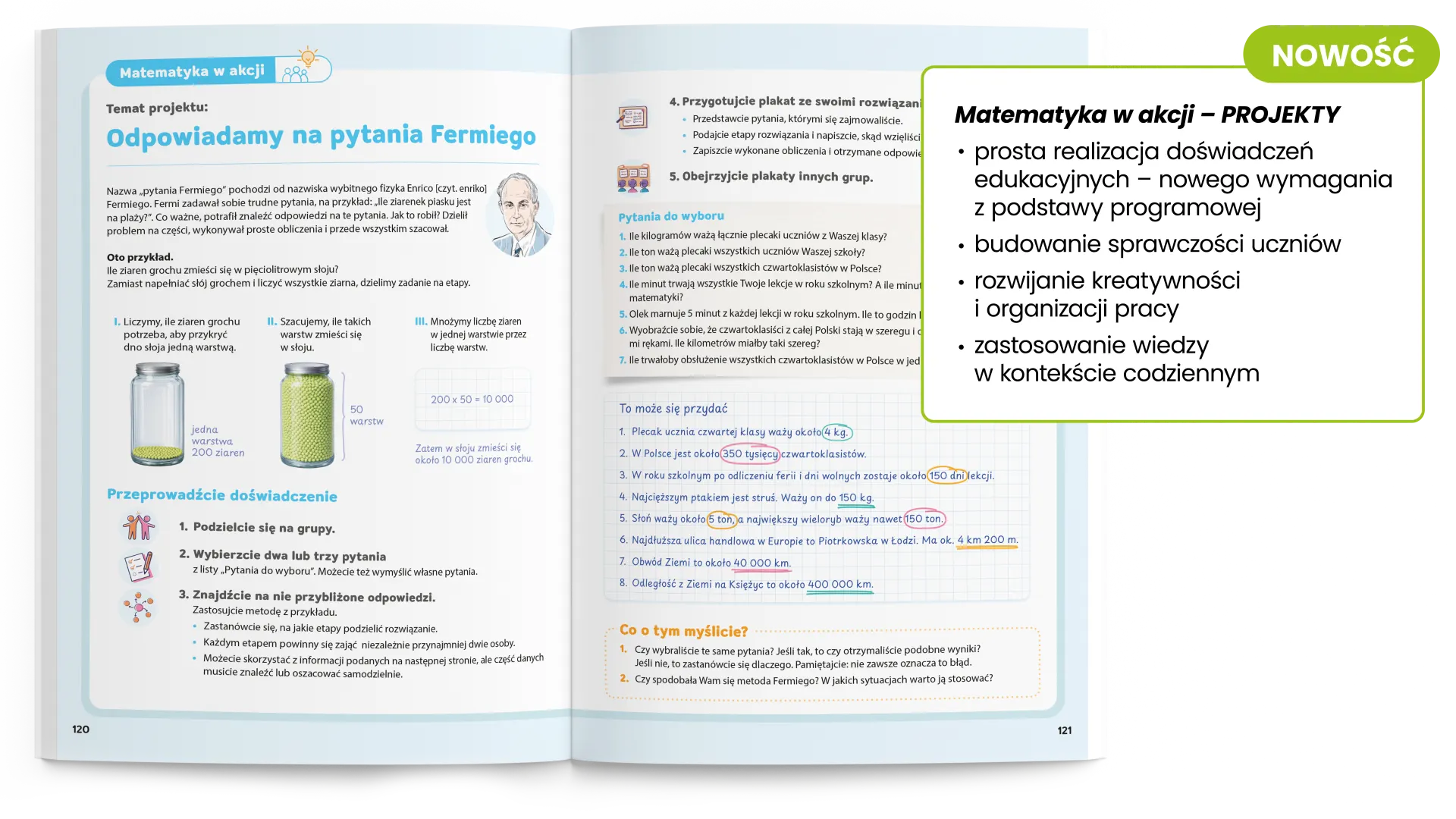 Zadania i projekty nawiązują do codziennych doświadczeń uczniów oraz sytuacji, które dobrze znają. Dzięki temu matematyka staje się bliższa i bardziej zrozumiała — uczniowie zaczynają dostrzegać ją w swoim otoczeniu i potrafią matematycznie opisywać proste sytuacje z życia.
