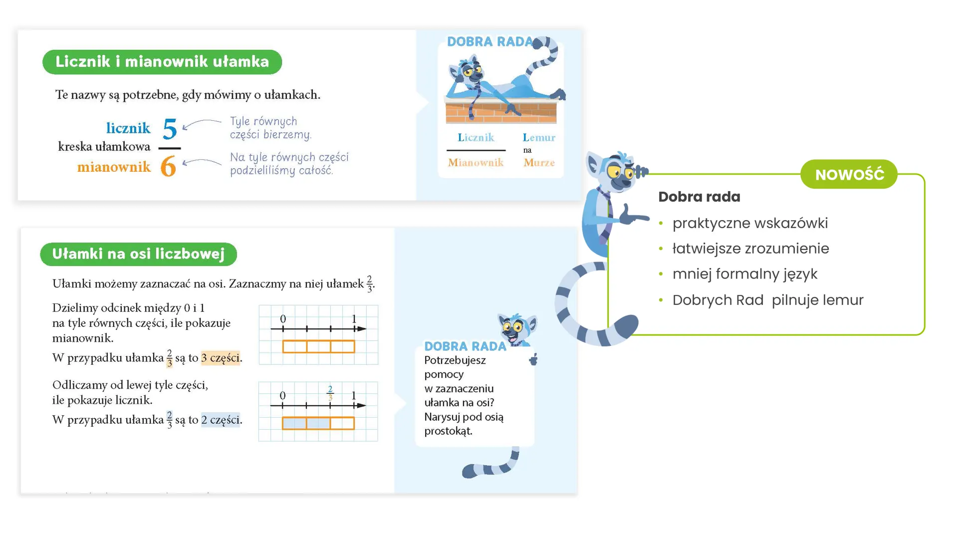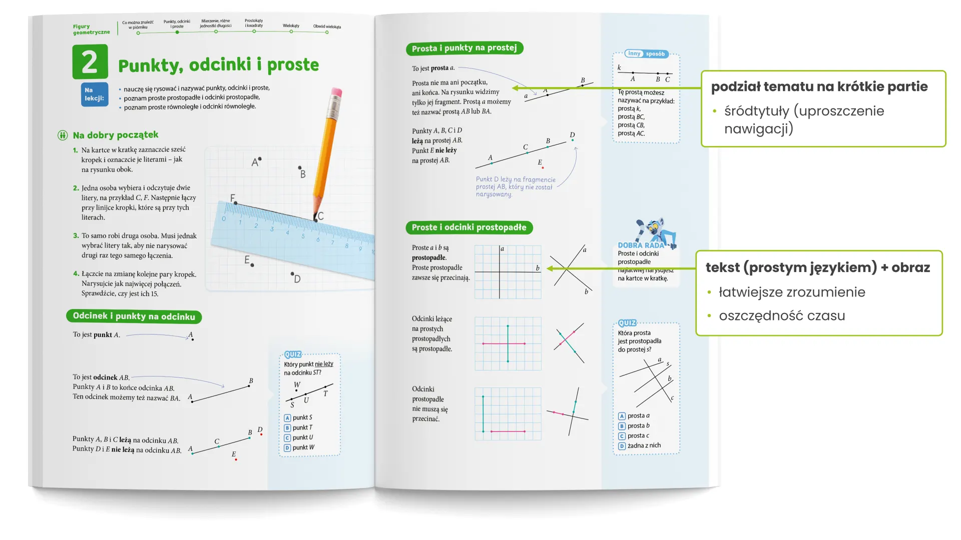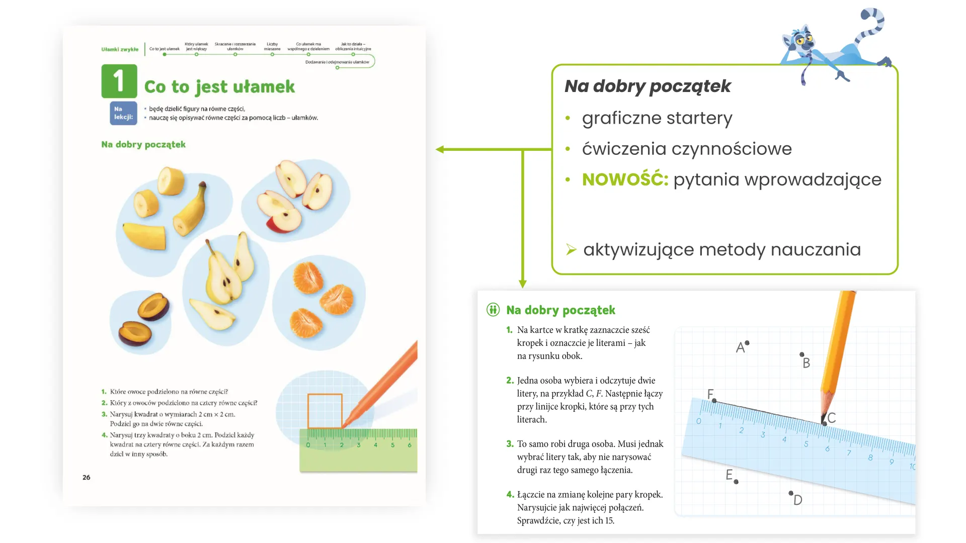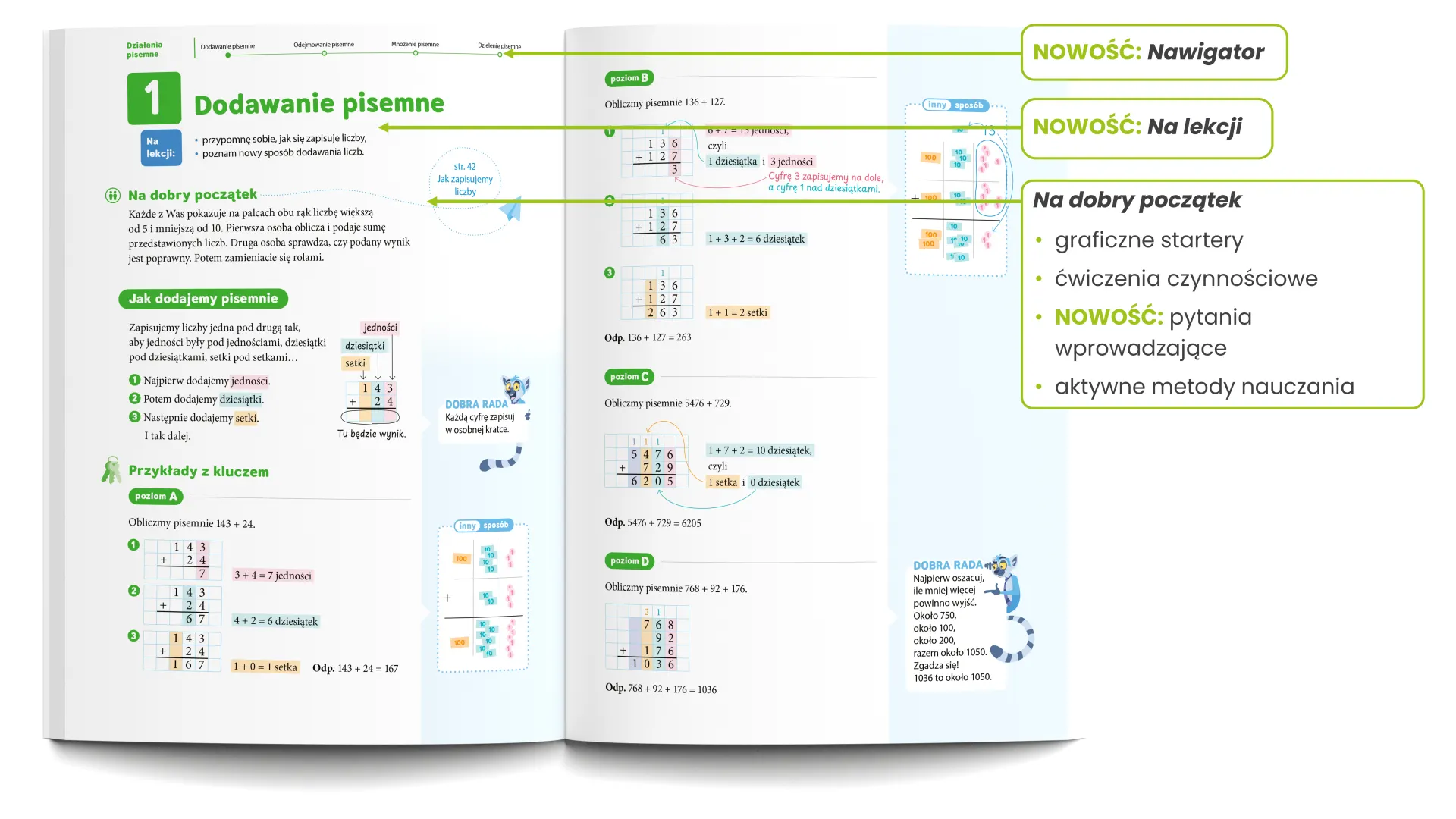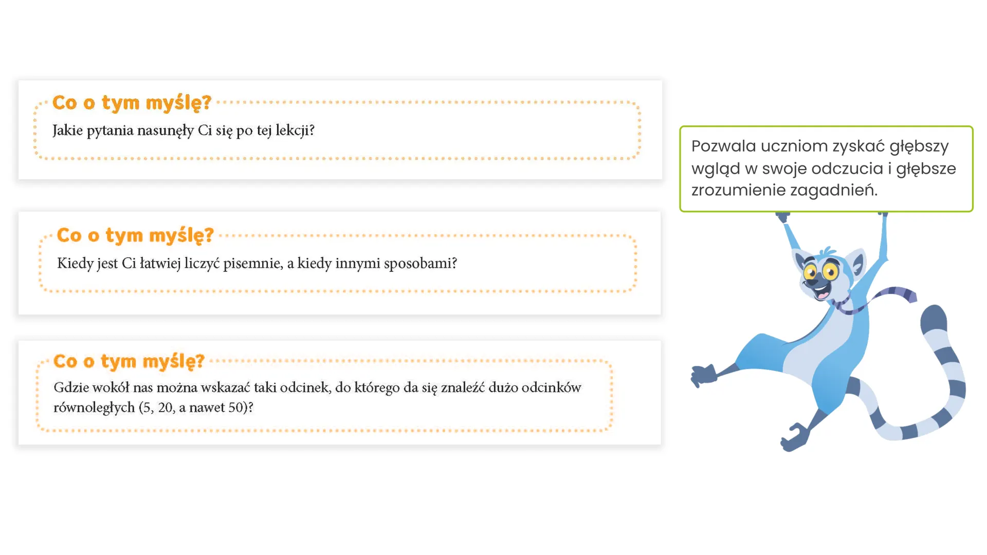 Uczniowie uczą się pracować samodzielnie – od zrozumienia nowego tematu po rozwiązanie zadania na różne sposoby. Jasne wskazówki i podpowiedzi napisane prostym językiem pomagają im szybciej zrozumieć materiał, budować pewność siebie i podejmować decyzje.