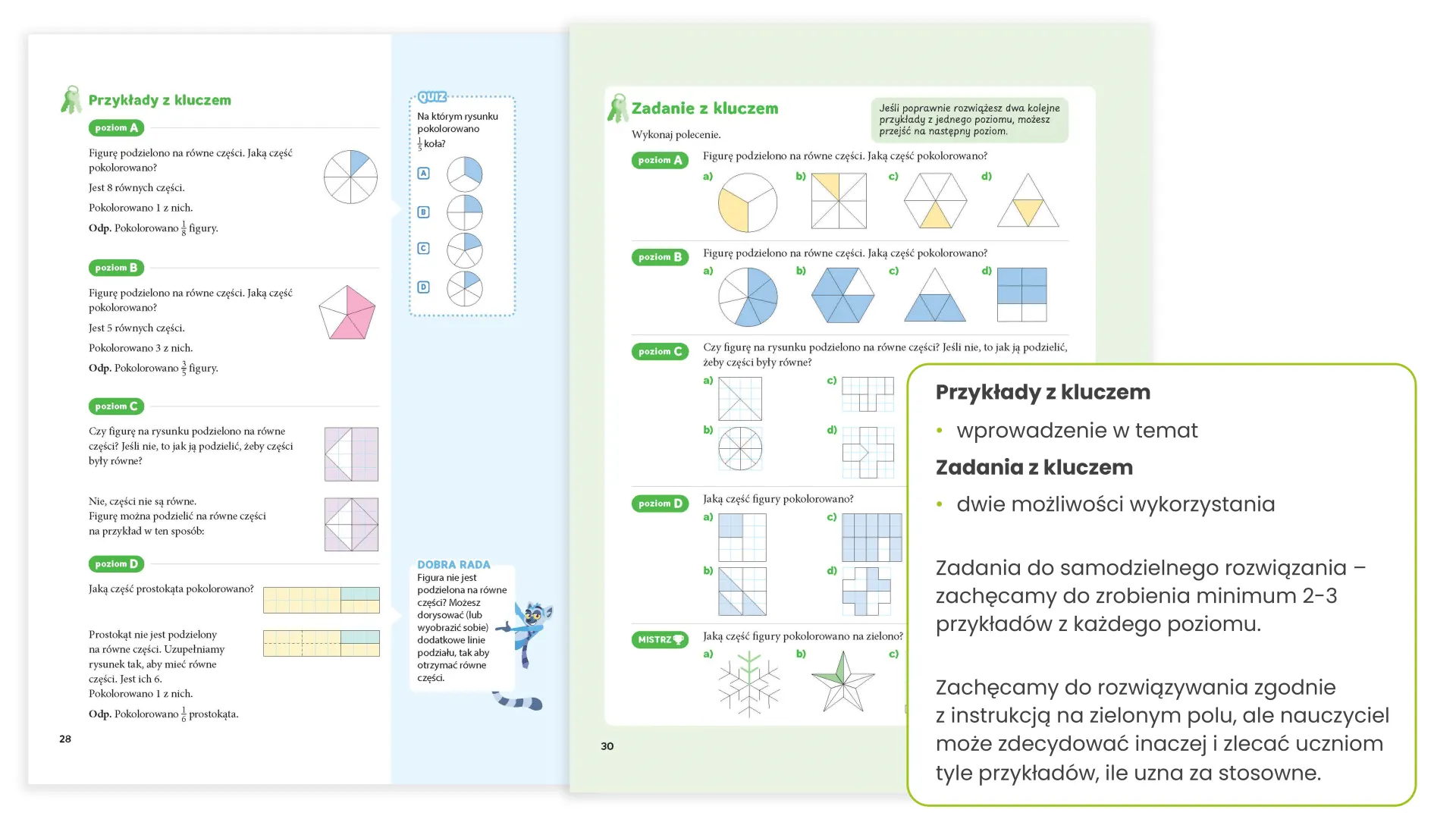 Uczniowie najpierw poznają sposób rozwiązania zadania, a następnie samodzielnie pracują nad podobnymi przykładami, we własnym tempie. Stopniowanie trudności i jasne wskazówki sprawiają, że każdy może osiągnąć sukces – także uczniowie ze specjalnymi potrzebami edukacyjnymi.