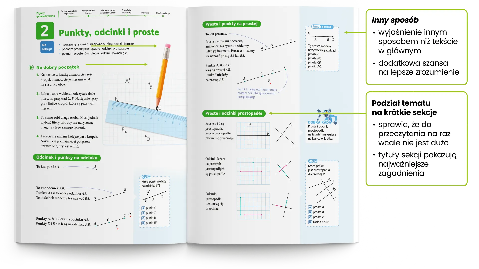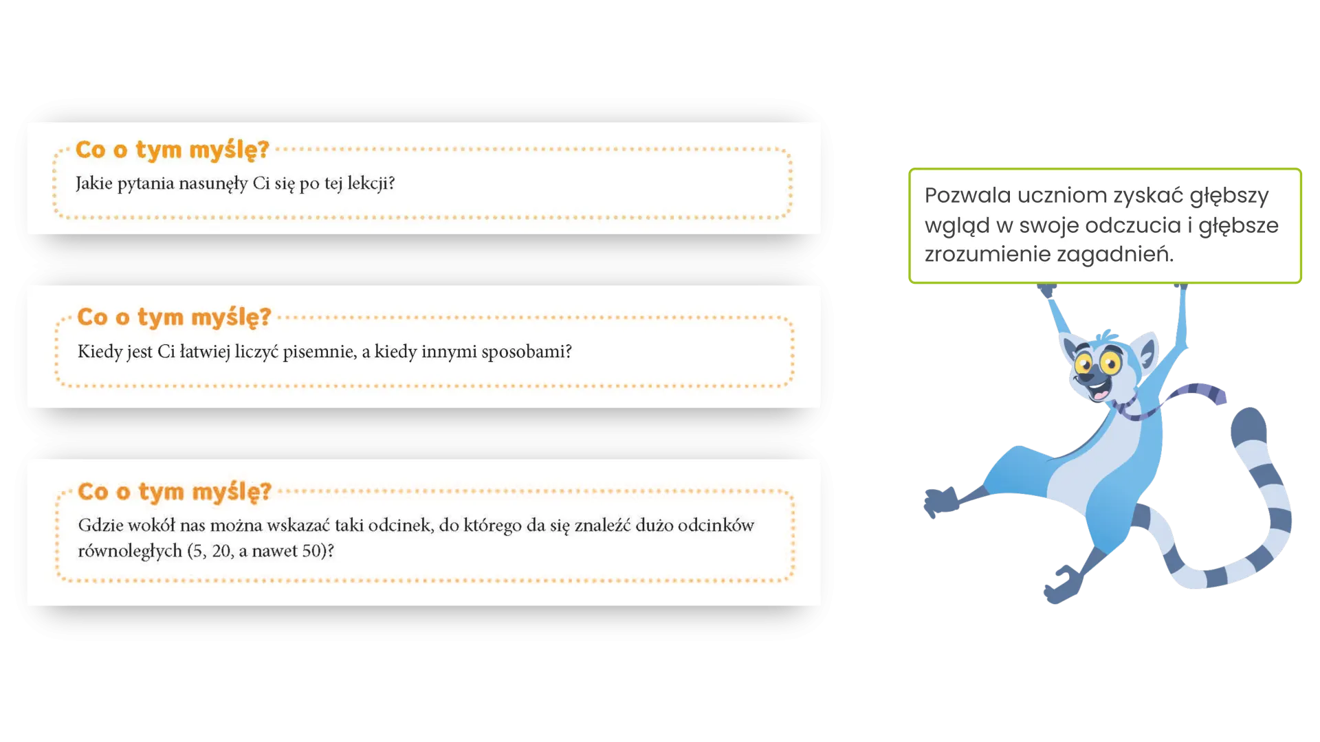 Uczniowie stopniowo uczą się samodzielnej pracy — od zrozumienia nowego tematu po wybór różnych sposobów rozwiązania zadania. Jasne, przystępnie sformułowane wskazówki wspierają ich w szybkim uchwyceniu sensu materiału, wzmacniają poczucie pewności siebie i pomagają podejmować trafniejsze decyzje podczas nauki.