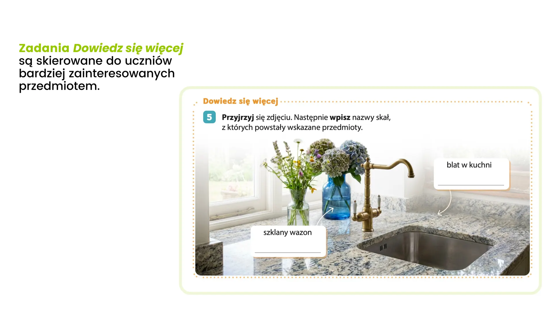 Stała, przewidywalna struktura lekcji porządkuje treści i buduje zrozumienie krok po kroku. Poszczególne elementy tematu naturalnie prowadzą uczniów od ciekawych pytań, przez obserwacje i doświadczenia, aż po zrozumienie i utrwalenie w pamięci. A gdy przychodzi czas na sprawdzenie wiedzy i umiejętności, rozwiązywanie zróżnicowanych zadań, o różnym stopniu trudności, zamienia się w grę w zdobywanie diamentów.