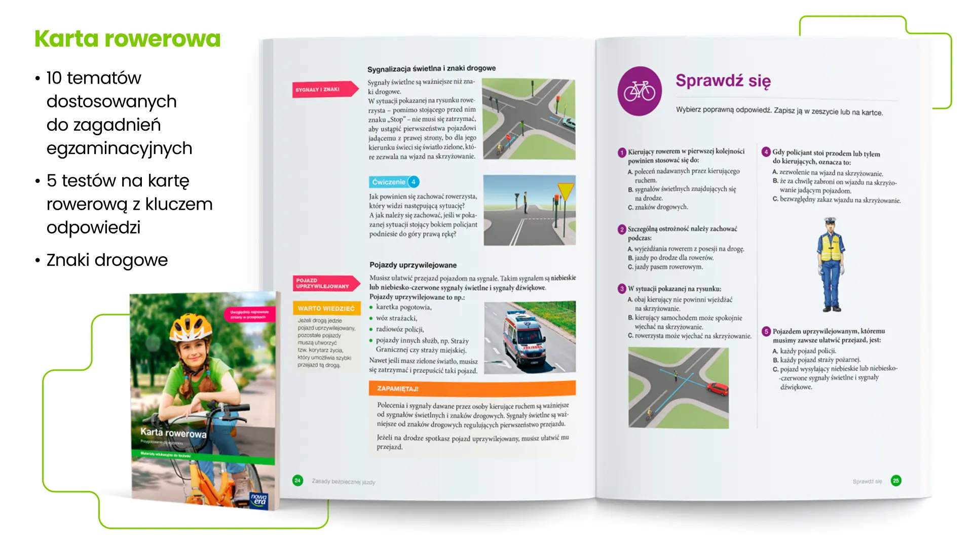 publikacja przygotowująca do egzaminu na kartę rowerową. Zawiera wszystkie niezbędne wiadomości podane w atrakcyjnej dla ucznia formie i przykładowe testy egzaminacyjne