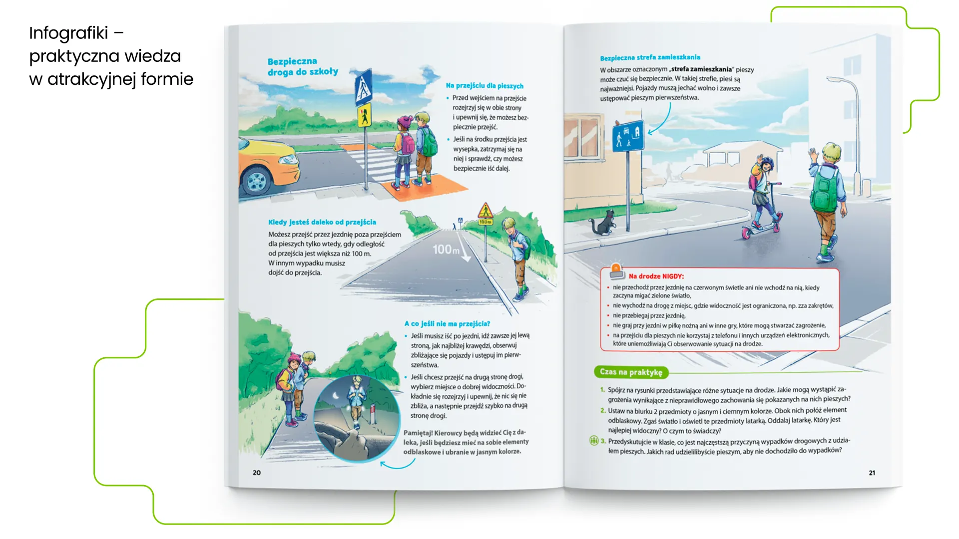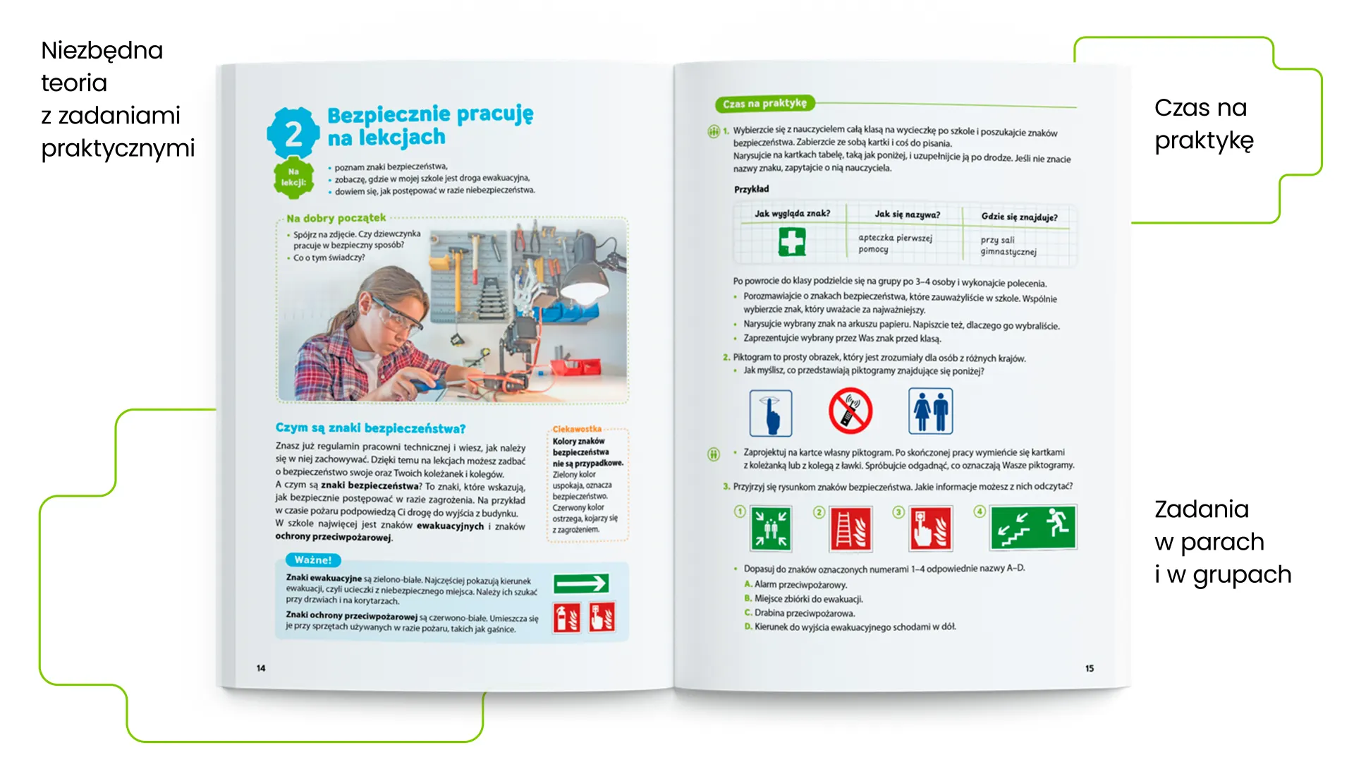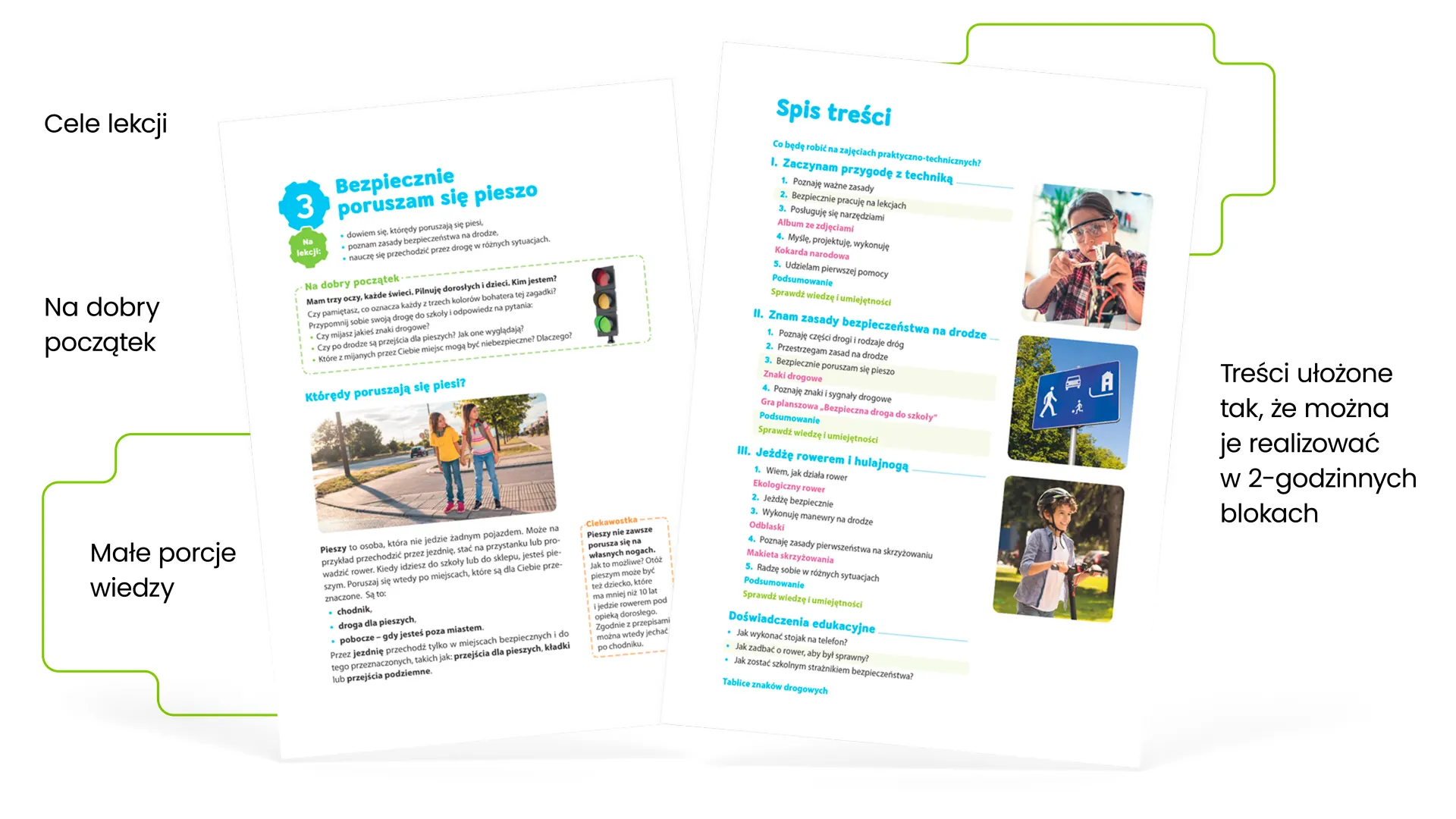 atrakcyjne tresci (m. in. zadania Czas na praktykę, infografiki, projekty i doświadczenia edukacyjne) ułożone tak, aby można było je realizować w dwugodzinnych blokach