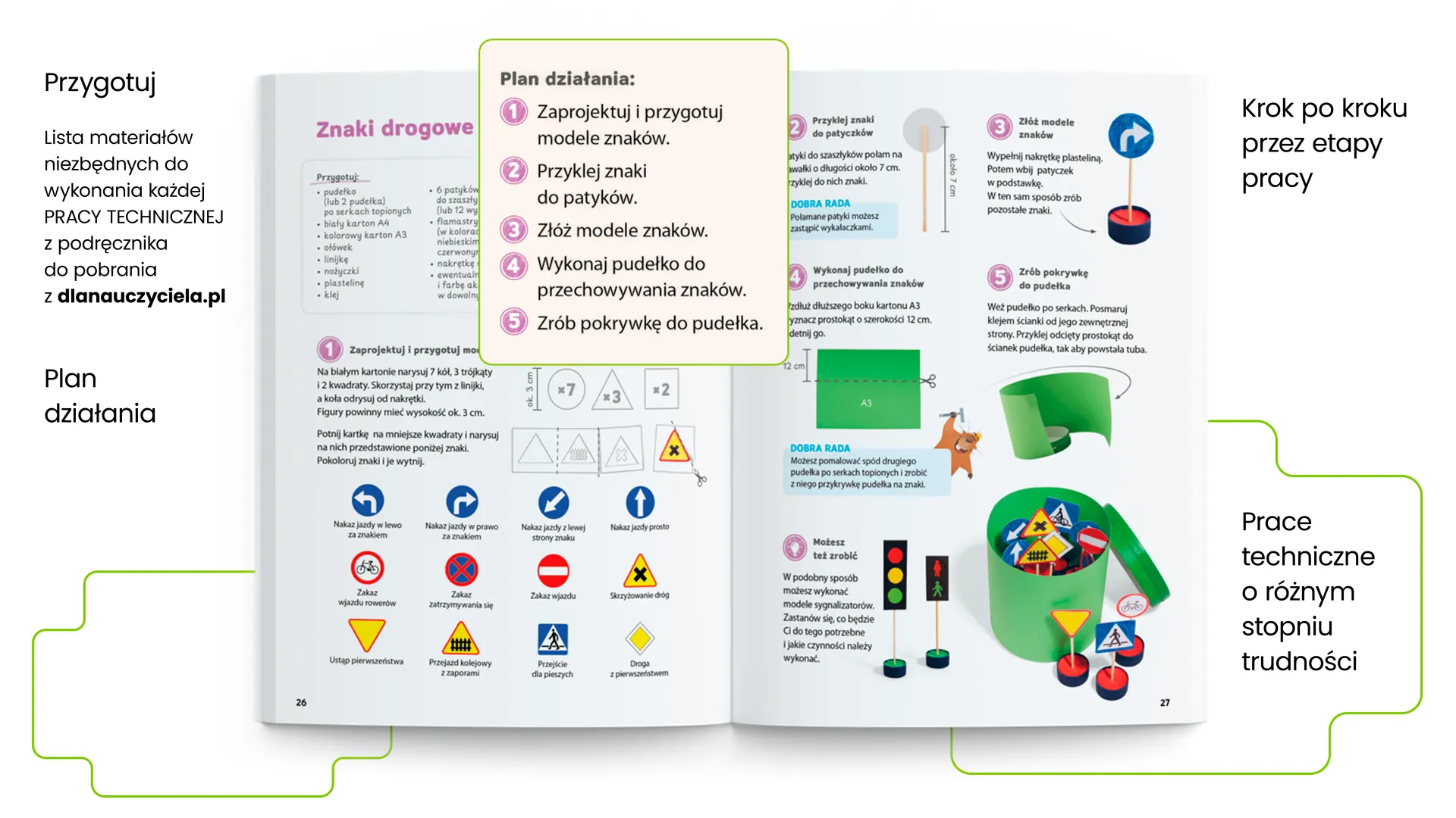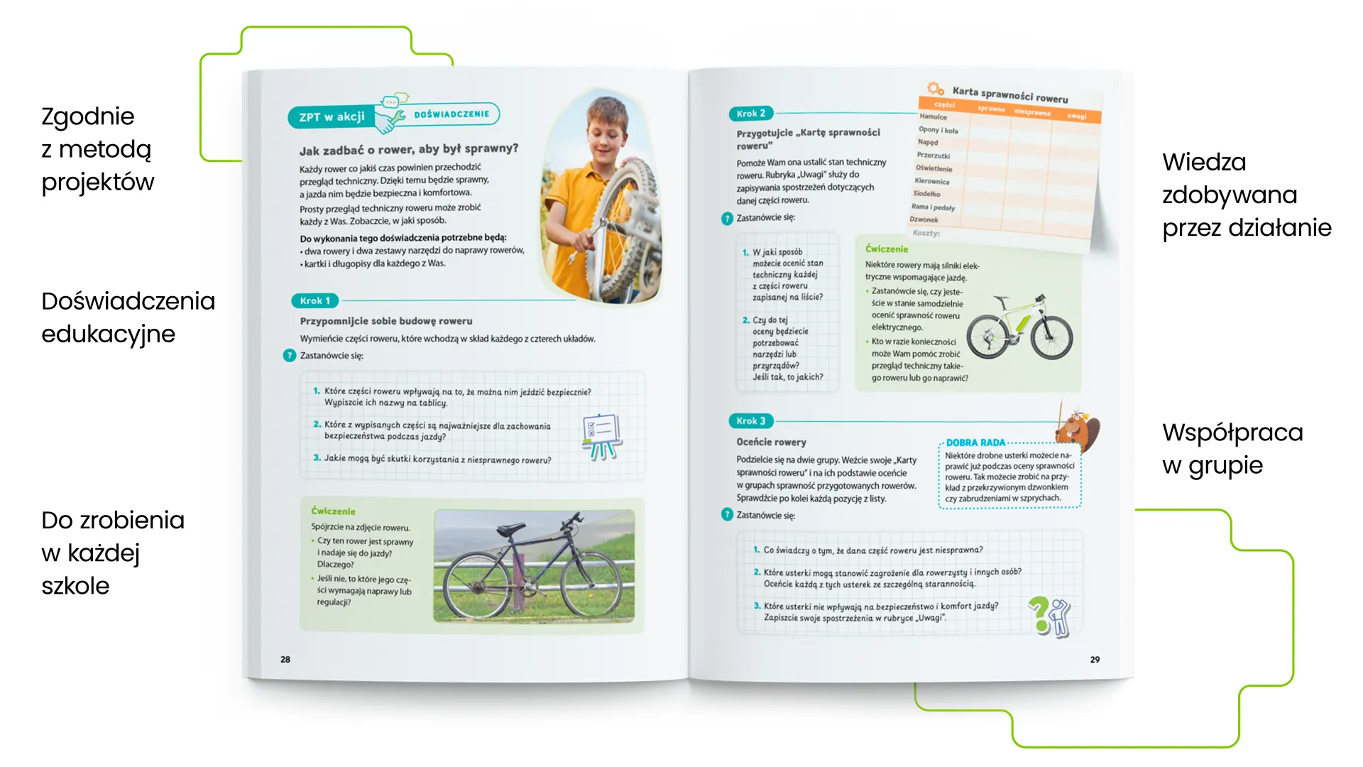 Teoria od razu zamienia się w działanie. Uczniowie samodzielnie wykonują prace techniczne, natomiast wspólnie realizują projekty, mając do dyspozycji plan działania oraz wskazówki, jak przejść przez kolejne etapy. Wszystkie zadania można wykonać w każdej szkole, niezależnie od wyposażenia pracowni i poziomu klasy.