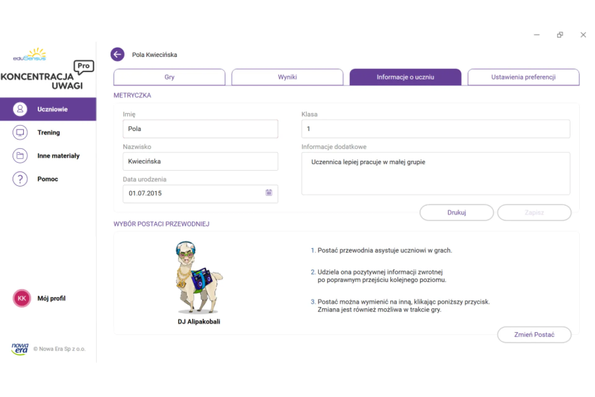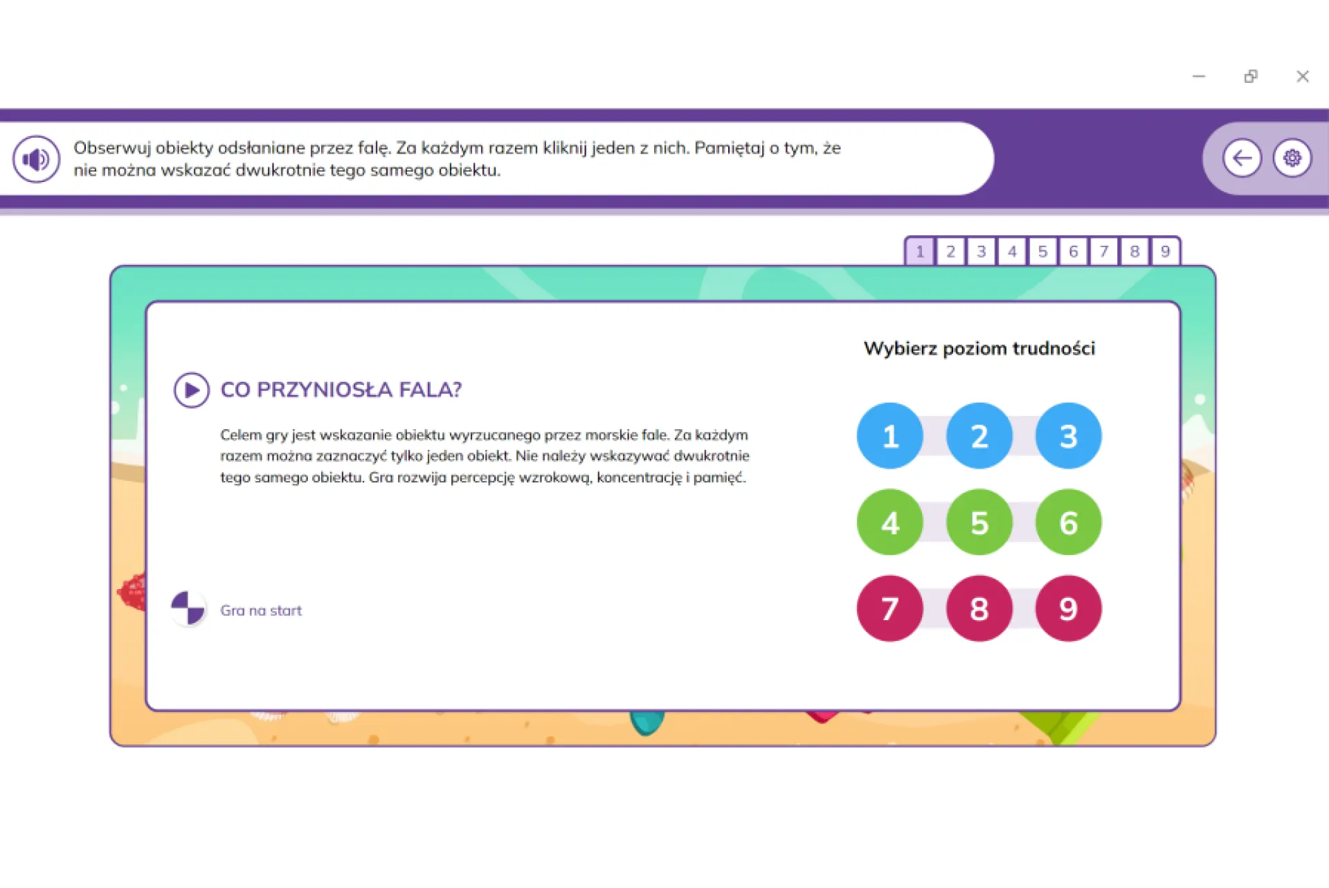 Program pozwala na indywidualne dostosowanie poziomu trudności gier do możliwości danego ucznia. Oprócz wybierania jednego z 9 etapów różniących się stopniem zaawansowania nauczyciel może także: