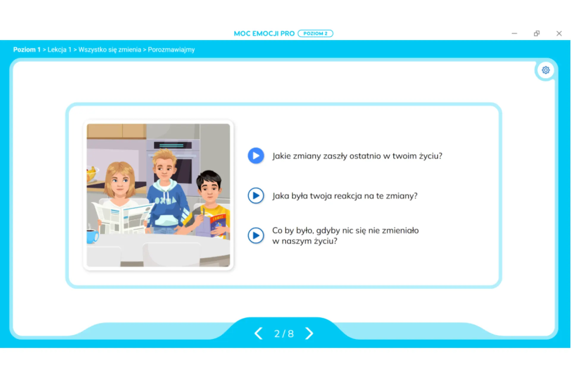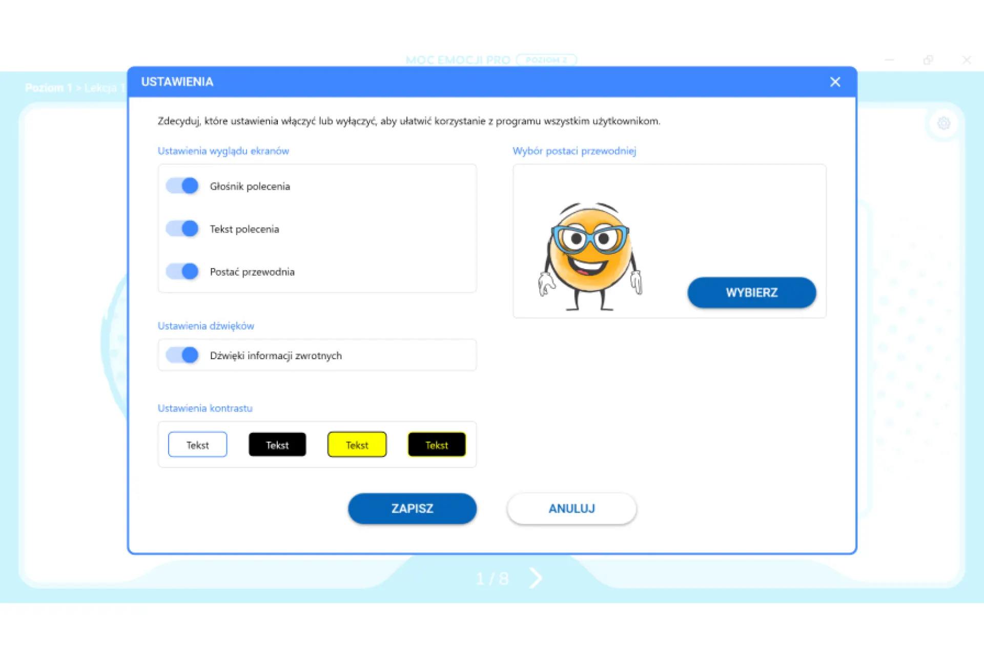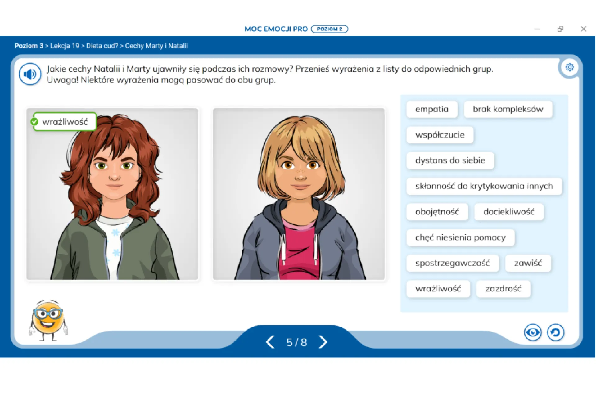 MOC EMOCJI PRO. Kompetencje emocjonalno-społeczne. Poziom 2 to program multimedialny zawierający 60 lekcji multimedialnych: 240 interaktywnych ćwiczeń oraz 60 multimedialnych materiałów edukacyjnych.