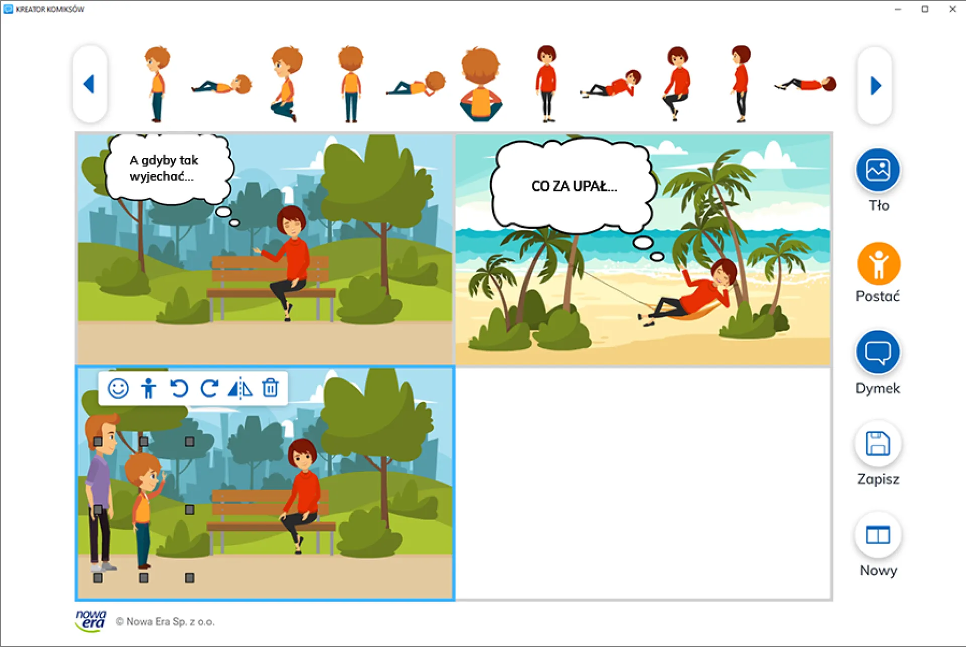 Wielofunkcyjne narzędzie, dzięki któremu uczniowie mogą rozwijać swoją inwencję, planować rozwój wydarzeń i w prosty sposób kreować sytuacje z wybranymi bohaterami. Gotowy komiks można wydrukować.