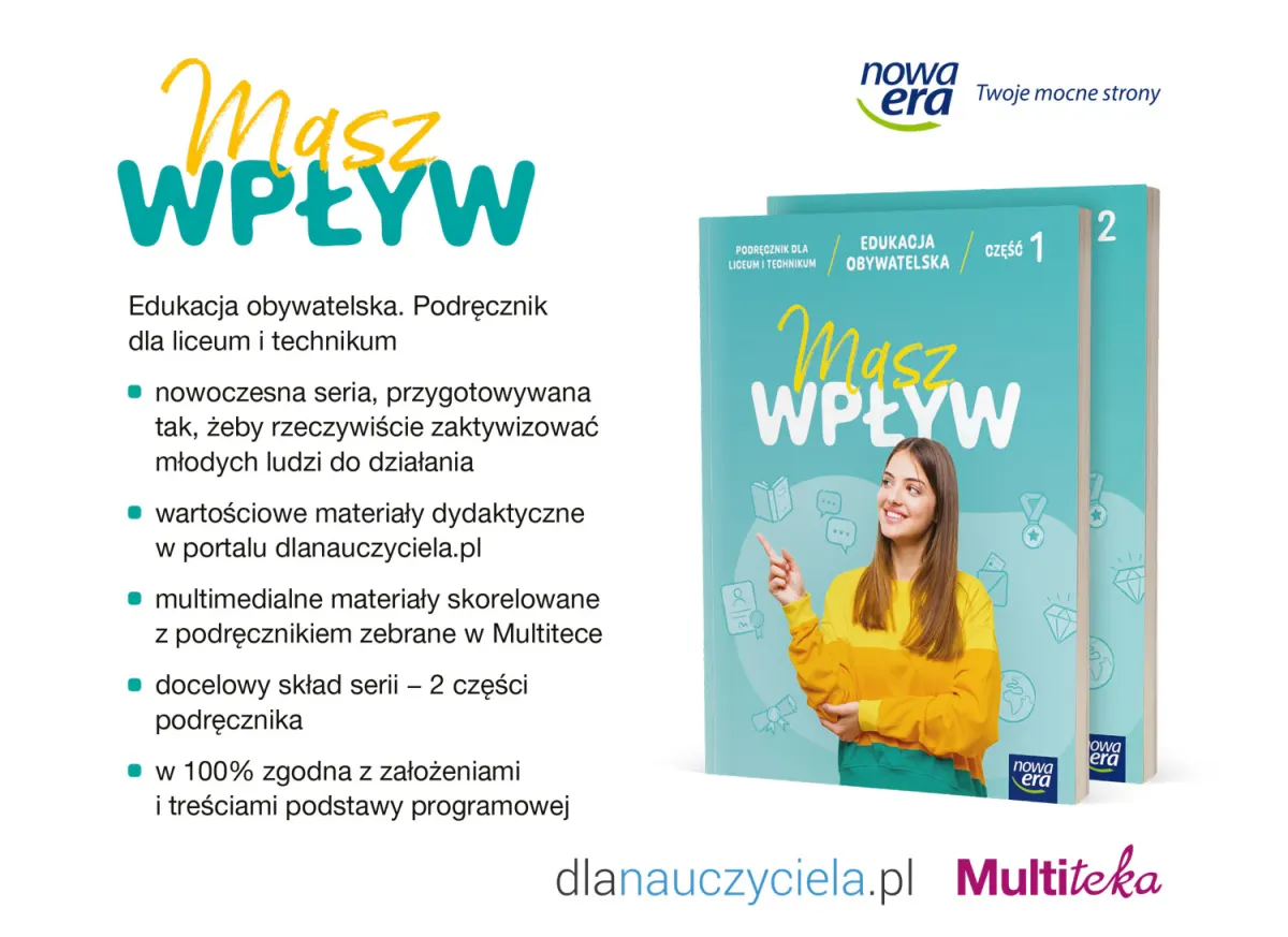 Podręcznik nosi tytuł „Masz wpływ” i zawiera treści dotyczące postaw obywatelskich, inicjatyw społecznych oraz zasad funkcjonowania państwa i społeczeństwa obywatelskiego. Materiały zostały opracowane tak, aby rozwijać w uczniach świadomość obywatelską, umiejętność krytycznego myślenia i poczucie sprawczości. To nowoczesny podręcznik, który – oprócz treści nauczania – oferuje przystępne wyjaśnienia, bogatą szatę graficzną oraz liczne elementy aktywizujące ucznia. Co istotne, w pełni odpowiada wymaganiom podstawy programowej przedmiotu edukacja obywatelska, zapewniając nauczycielom narzędzie zgodne z obowiązującymi standardami kształcenia.