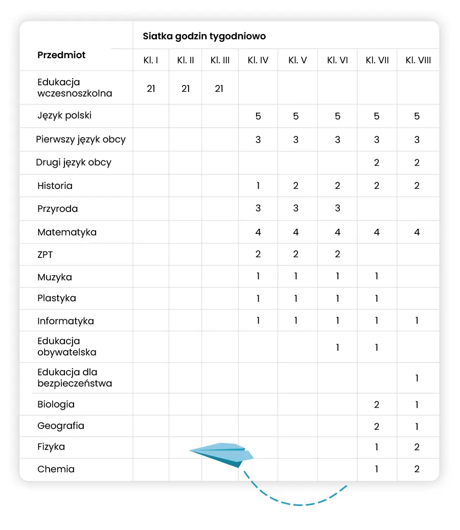 Reforma przewiduje dostosowanie tygodniowych wymiarów godzin do aktualnych potrzeb uczniów. Tabela poniżej pokazuje, ile godzin tygodniowo przeznaczono na poszczególne przedmioty w nowej siatce.